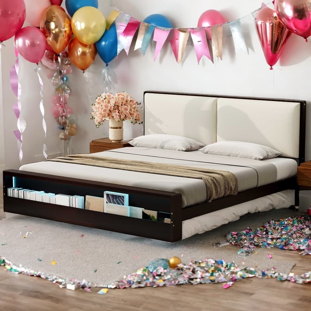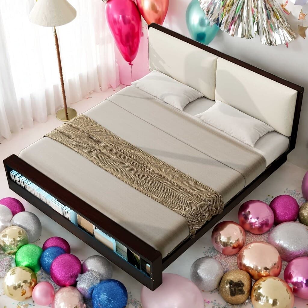 [Upholstery Headboard] The wider headboard of the bed, filled with high-density sponge inside, soft and breathable, bringing you a comfortable backrest experience. Fabric upholstery bed frame bestows a touch of classy elegance; Enjoy comfortably reading or watching TV in bed.. [Built-in Bookshelf with LED Light] With a storage bookshelf under the platform bed to meet your different storage needs. The bookshelf can make it easy to store a variety of books or little necessiities. Special built-in design makes them always stay in place.And it contains LED lights to make it easier for you to find. [Solid Construction] This platform bed frame with headboard is made of solid wood, with solid wood slats are available to support the bed for strong construction.Designed with headboard and footboard which are not only stable but also safe for you. [Easy to Clean] Coated in a naturally sophisticated espresso wear-resistant finish, keeping your frame pristine while also being easy to clean. Lend your sleeping space an air of refinement and a fresh, clean feeling every time you settle down for a good night’s rest. [Easy to Assemble] All parts included in your package are indicated clearly. With step-by-step installation manual and per-drilled holes, you can easily assemble this side table individually.Manual installation is recommended..