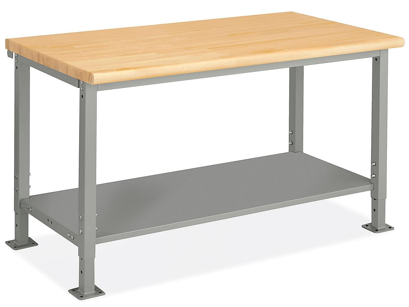 The heavyweight champ of packing tables. Recommended for machine shops, assembly plants and industrial manufacturing. 1 3/4" thick maple top with rounded edges. Full perimeter, heavy-gauge steel frame holds up to a ton . Heavy-duty square tube legs. Adjustable height from 29 to 39" in 2" increments. Full-depth bottom shelf supports up to 500 lbs. Pre-drilled floor mounting pads. Packing Table Accessories and Replacement Top available. ULINE offers over 42,000 boxes, plastic poly bags, mailing tubes, warehouse supplies and bubble wrap for your storage, packaging, or shipping supplies.