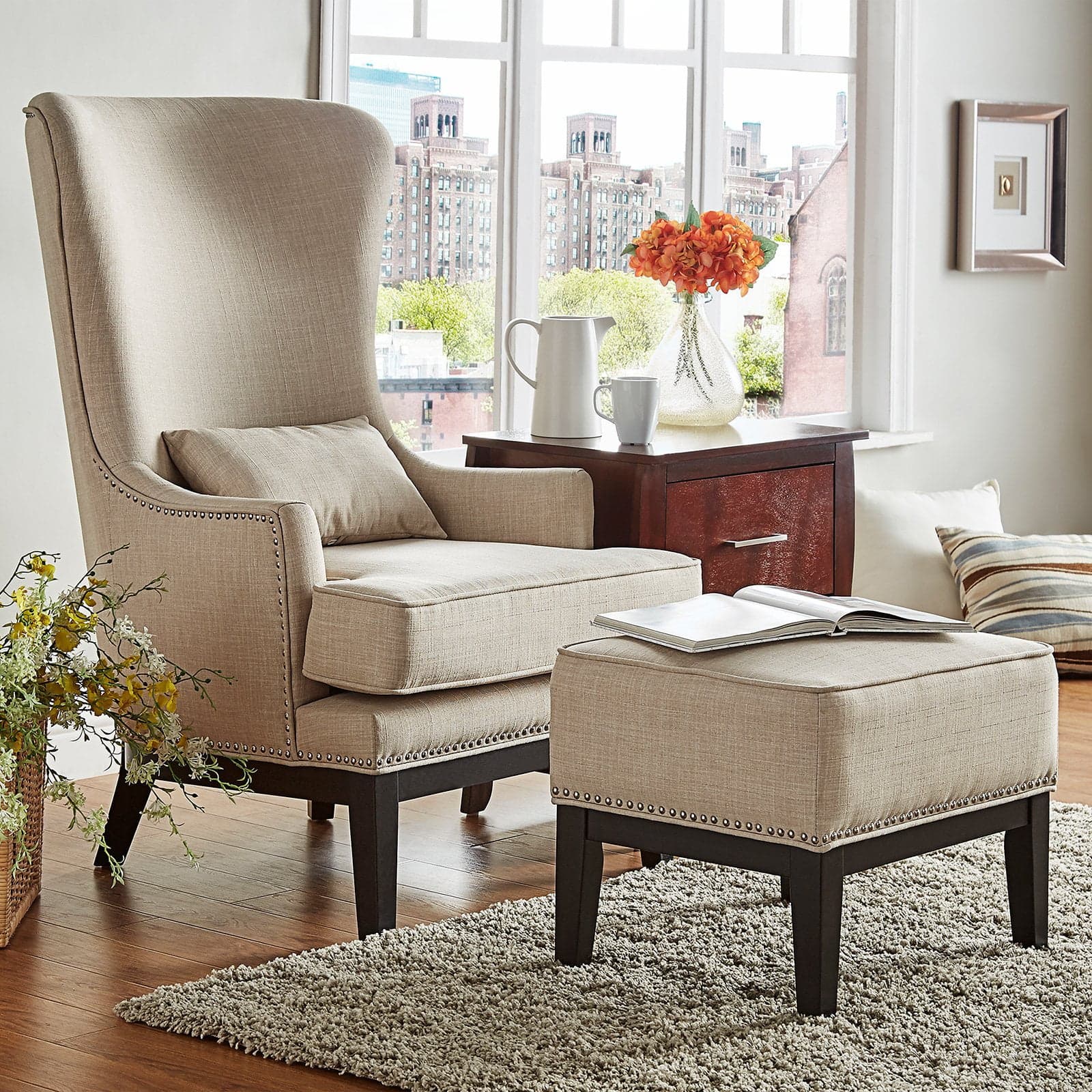 For comfortable seating and casual, chic style, introduce the Weston Home Marion Leisure Chair with Ottoman and Pillow into your sitting room, living space, or library. This chair is dressed in beige linen upholstery and graced by a stately modified wing back design. A plush T-shaped seat cushion, lumbar pillow, and matching ottoman maximize comfort. The chair sits on tapered wood legs and features an exposed wood base rail. A bright nail head trim adds an edge.