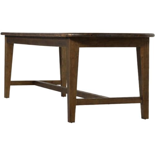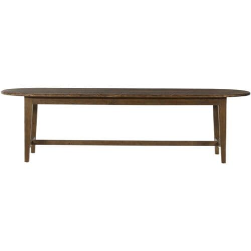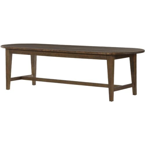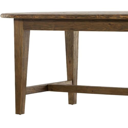 The Yasmin Dining Table is crafted from solid pine, weathered to achieve a charmingly distressed, farmhouse-style aesthetic. Its simple tapered legs provide sturdy support for the oval top, complemented by a stretcher and apron that enhance its beautifully traditional look. This table is designed to comfortably accommodate gatherings, making it a perfect centerpiece for any dining space.