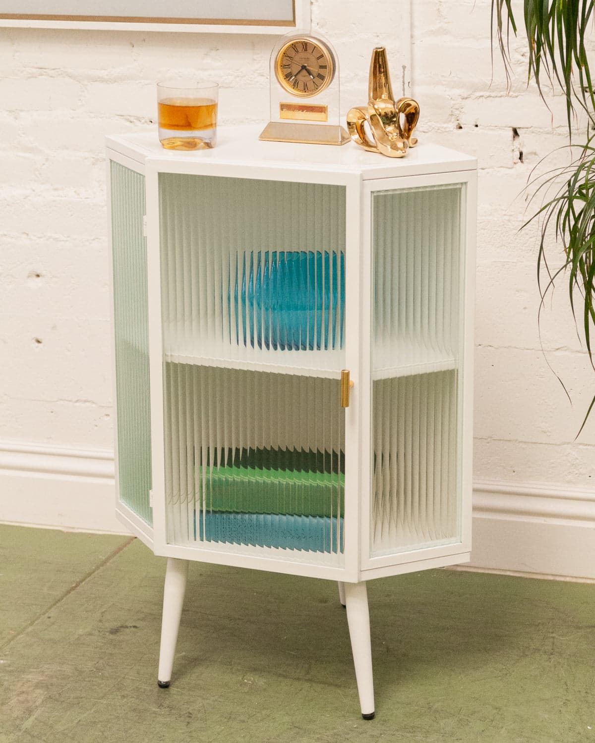 Style No. MODZ2-112024-CPC — This item is Modern! All sales are final. No returns, refunds, or exchanges. WHY WE LOVE IT! Corner Piece Cabinet Inspired by Mid-Century Modern design, this stunning Modern Low-Profile Media Console is a welcome addition to any home. Perfect for displaying your decorative objects, books, and more!