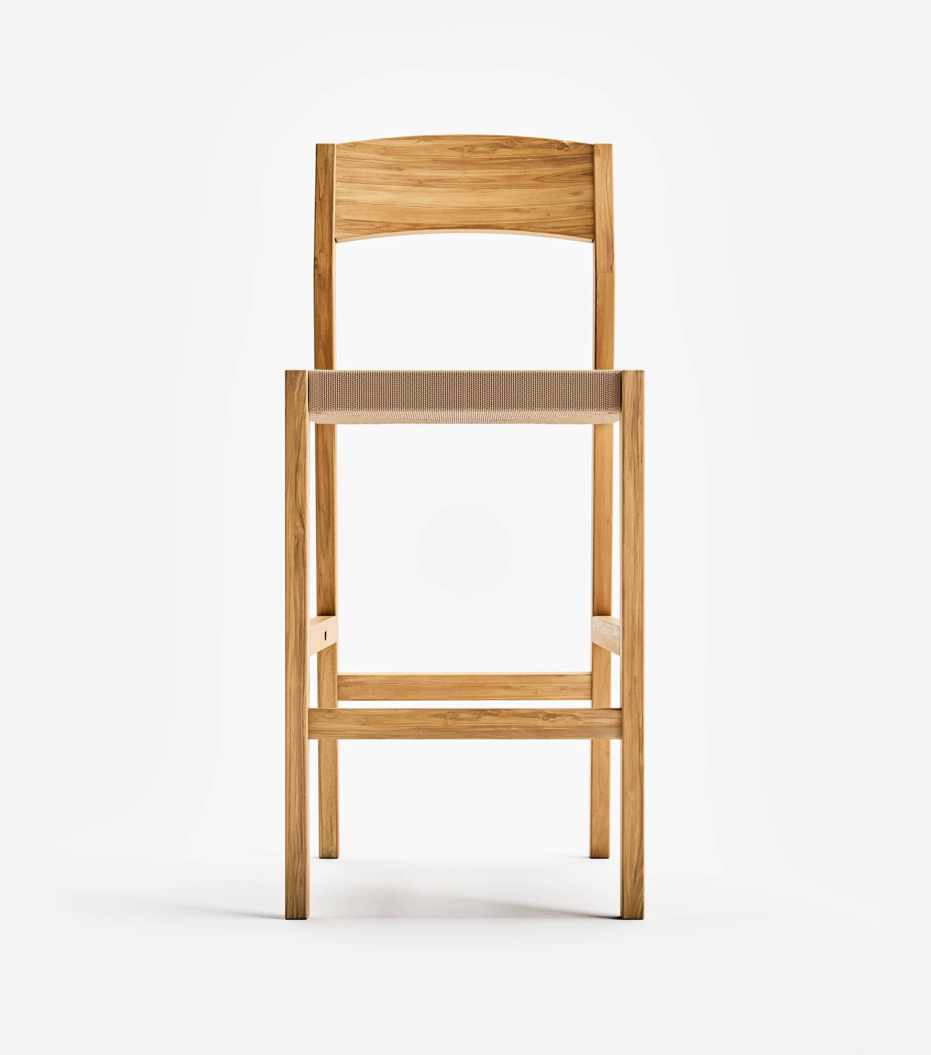 The Calvero Stool, handcrafted from FSC® certified teak wood, features a unique handwoven design. This sustainable furniture piece offers elegance, durability, and eco-friendly charm for bar or counter seating.
