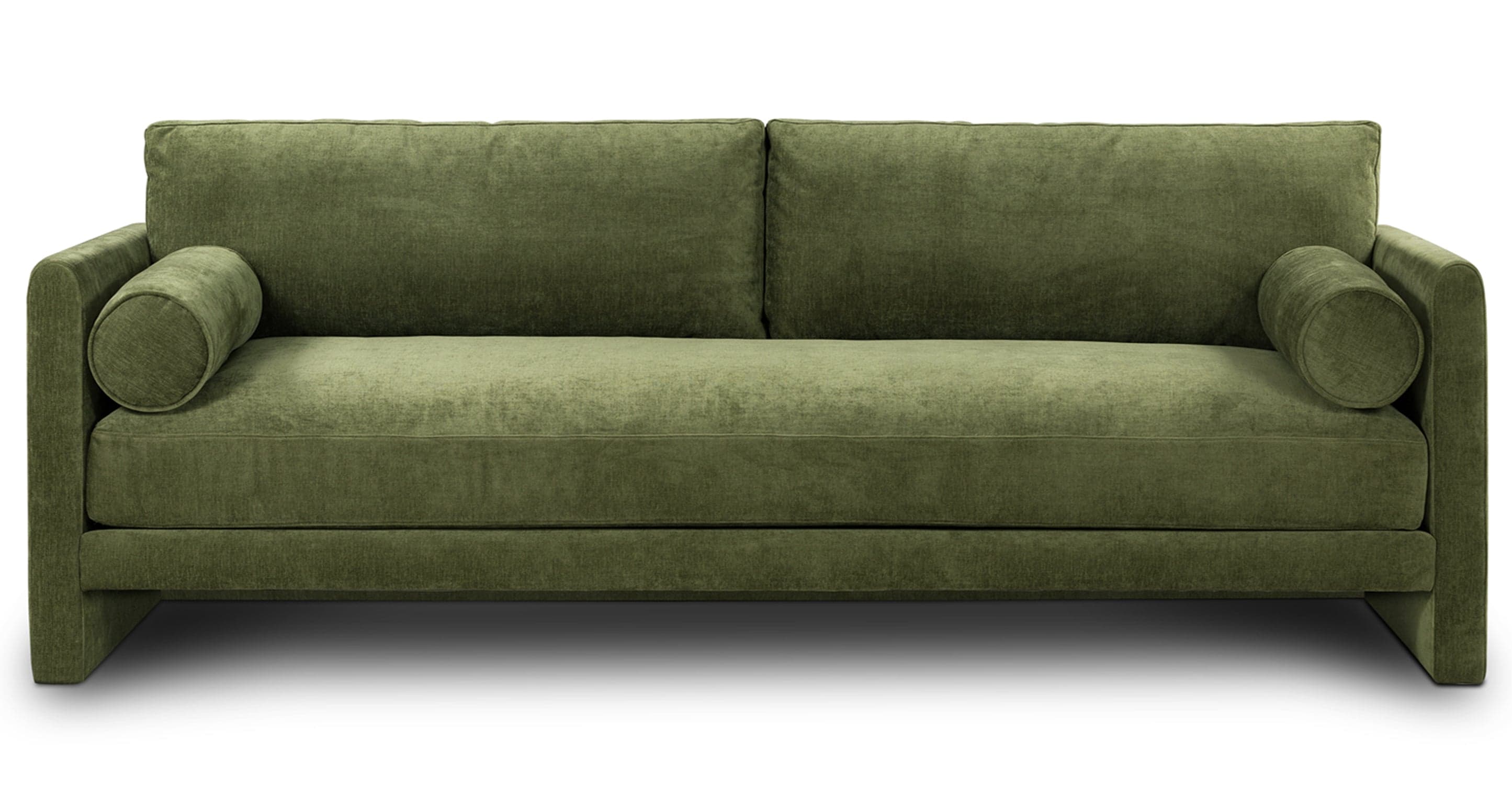 Draped in dreamy green fabric, sink into chic comfort with our Lea Sofa. This sofa was made to stand out with its fabric-to-the-floor base and rear curved frame â we think itâs the little details that make the biggest impact. A bench-style seat, loose back pillows, and two bolster pillows add that extra hint of class.