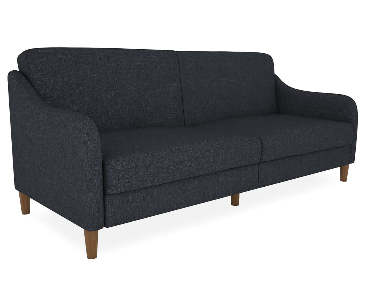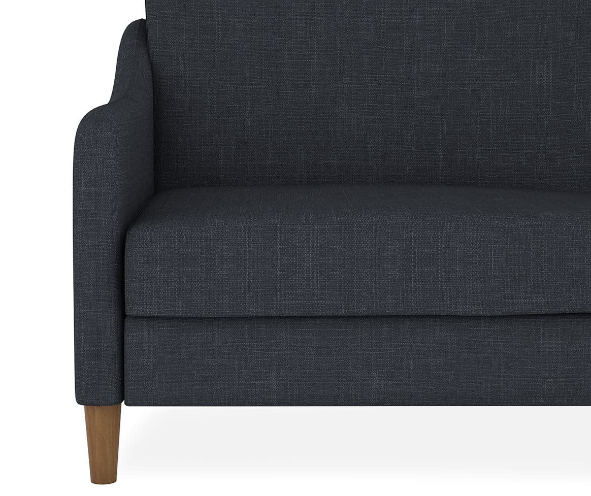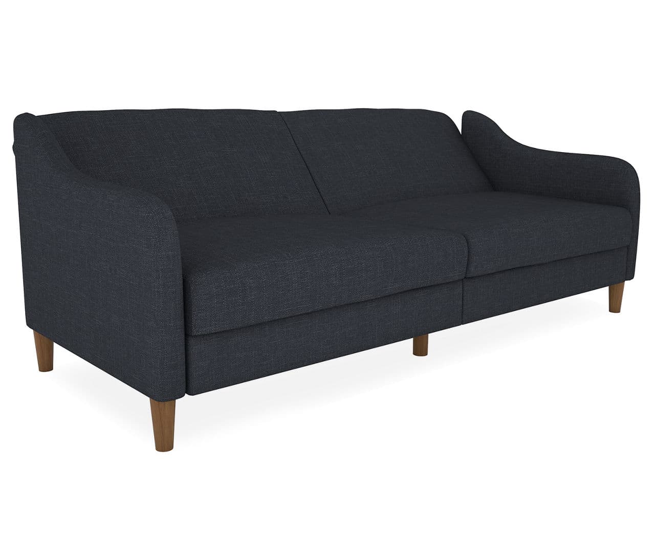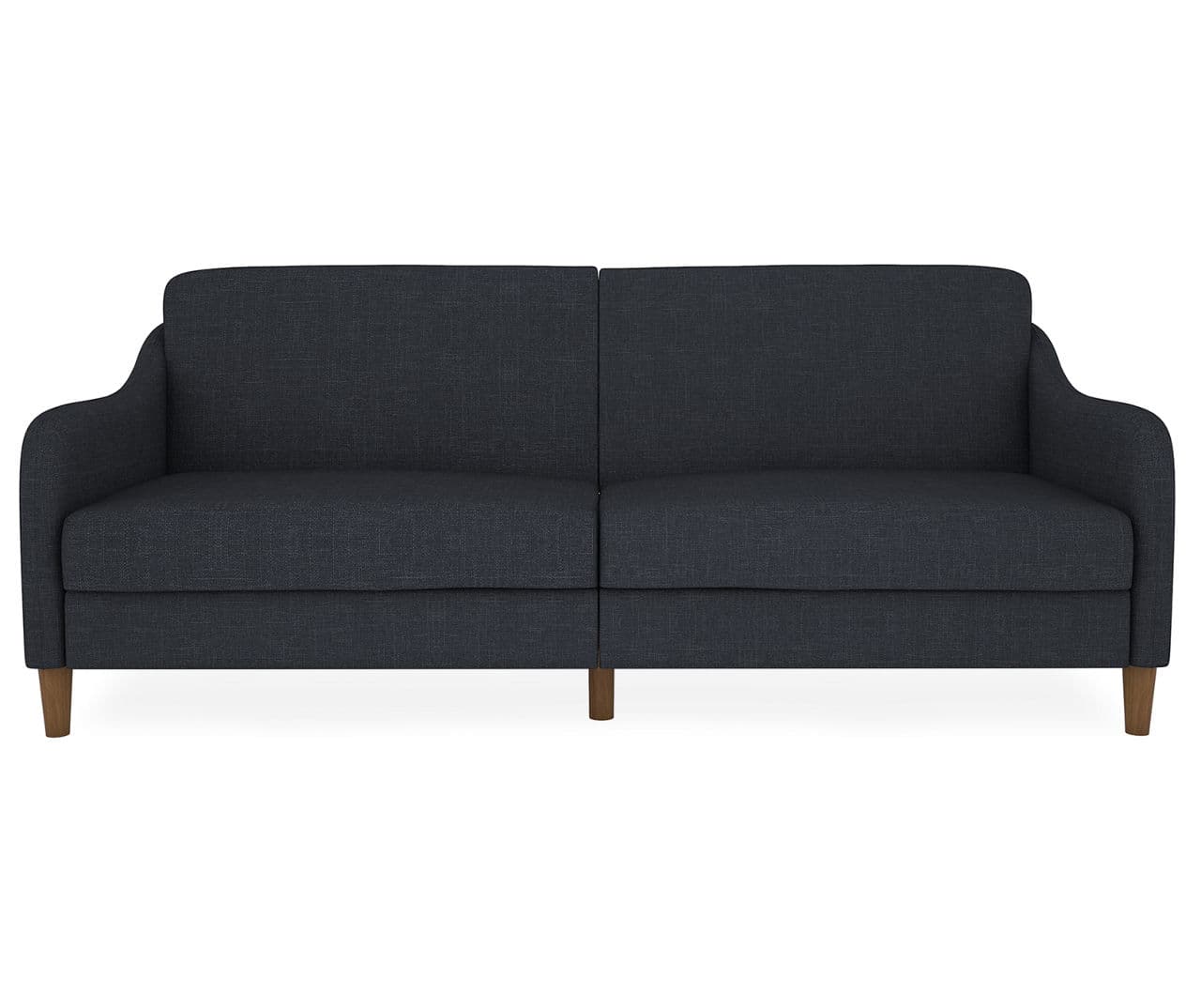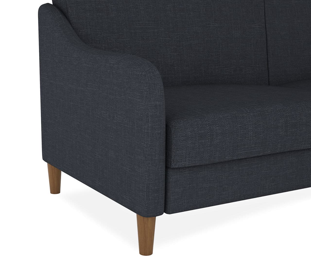 This navy blue Jasper sofa futon is the perfect mix between comfort and style. Upholstered in premium linen and featuring wing shaped arms with rounded wooden legs, it delivers a stunning modern look. The futon's core is built with robust wood as the cushions are made with independently encased coils and foam for ultimate comfort. Recline, lounge or sleep on this versatile piece which is perfect for coffee with friends, to hosting guests or watching a movie.