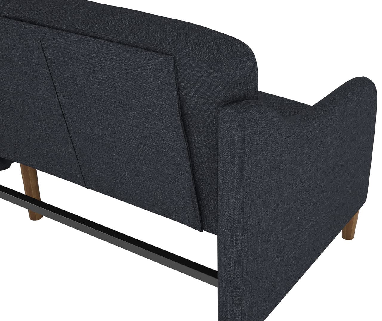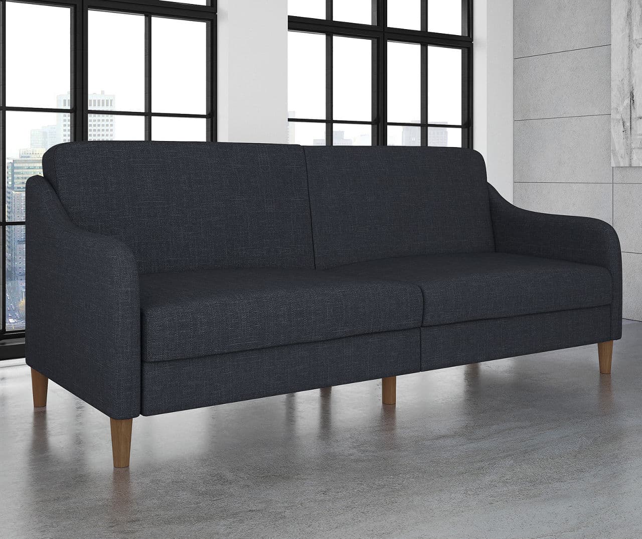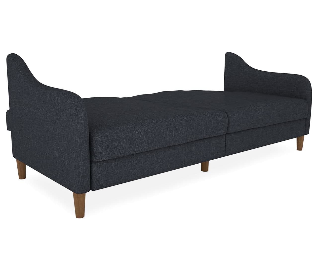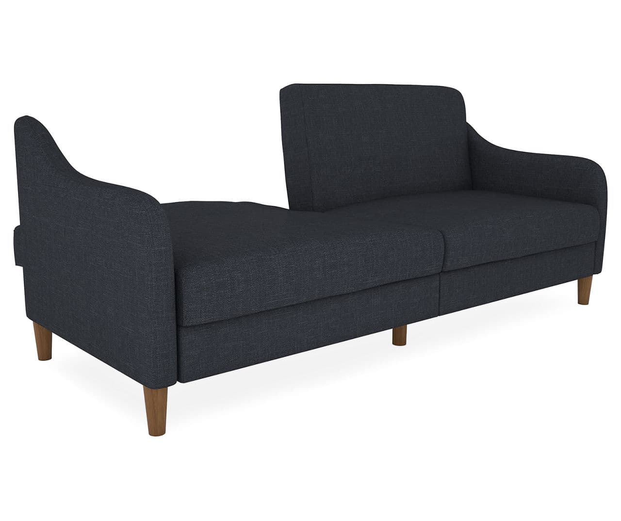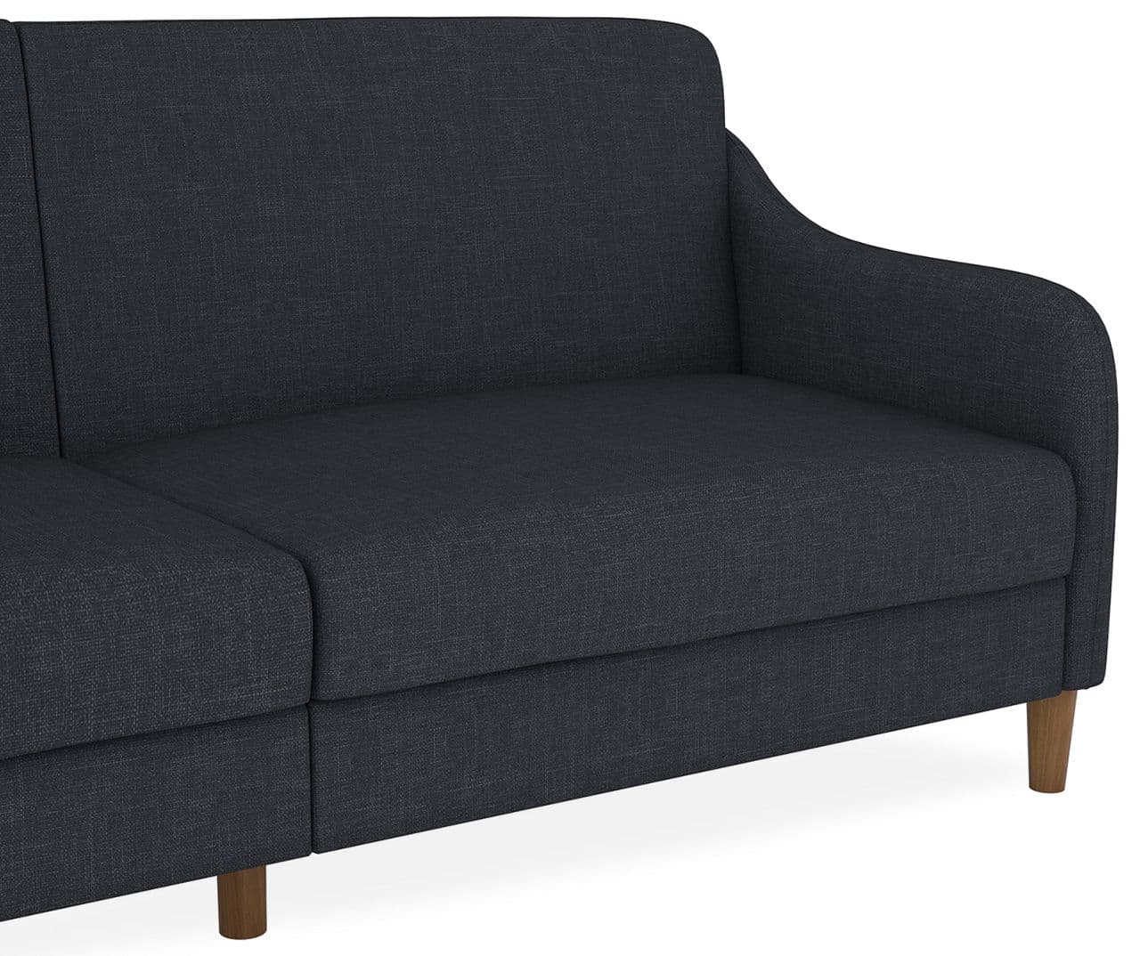 This navy blue Jasper sofa futon is the perfect mix between comfort and style. Upholstered in premium linen and featuring wing shaped arms with rounded wooden legs, it delivers a stunning modern look. The futon's core is built with robust wood as the cushions are made with independently encased coils and foam for ultimate comfort. Recline, lounge or sleep on this versatile piece which is perfect for coffee with friends, to hosting guests or watching a movie.