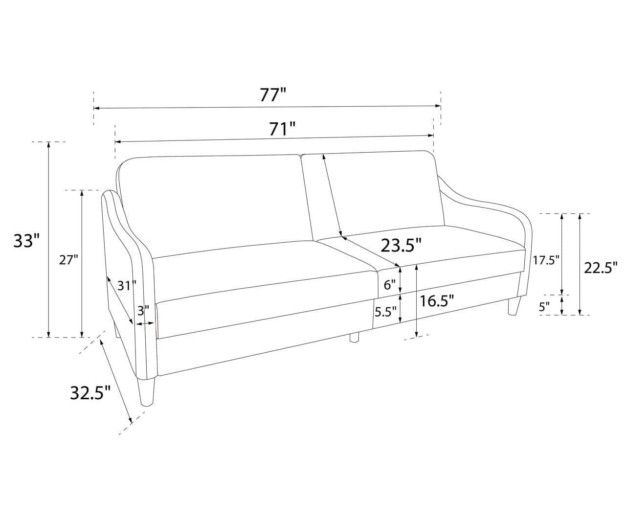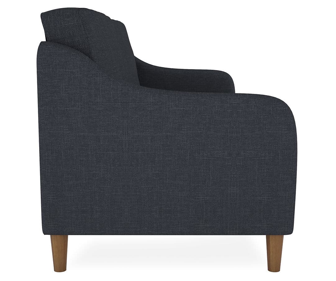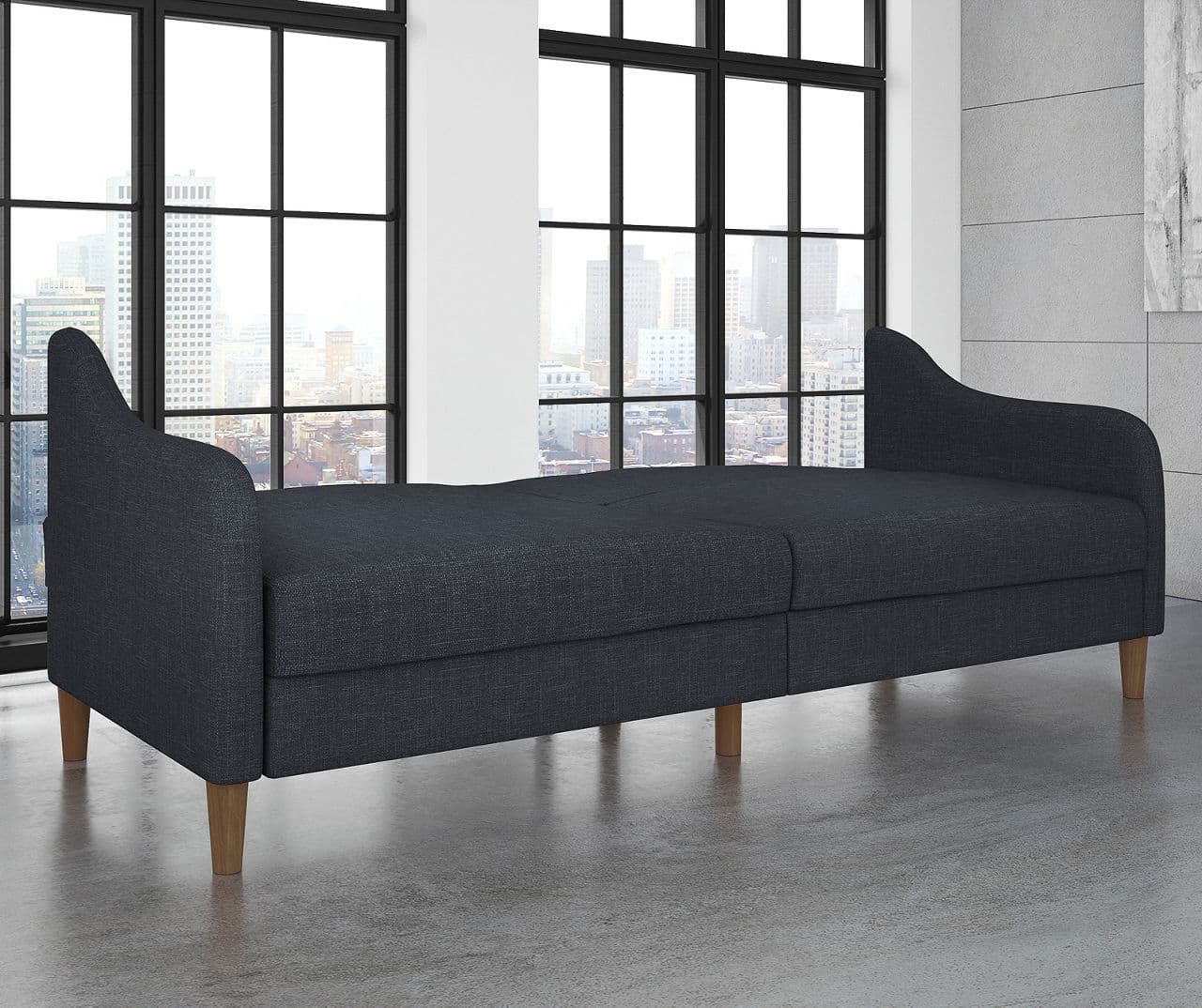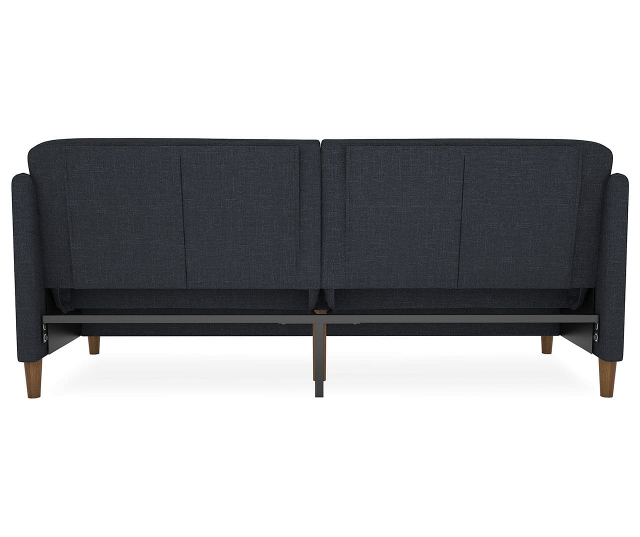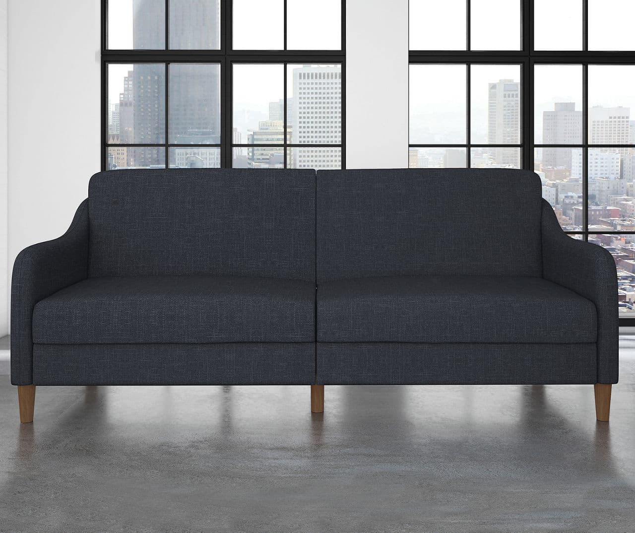 This navy blue Jasper sofa futon is the perfect mix between comfort and style. Upholstered in premium linen and featuring wing shaped arms with rounded wooden legs, it delivers a stunning modern look. The futon's core is built with robust wood as the cushions are made with independently encased coils and foam for ultimate comfort. Recline, lounge or sleep on this versatile piece which is perfect for coffee with friends, to hosting guests or watching a movie.