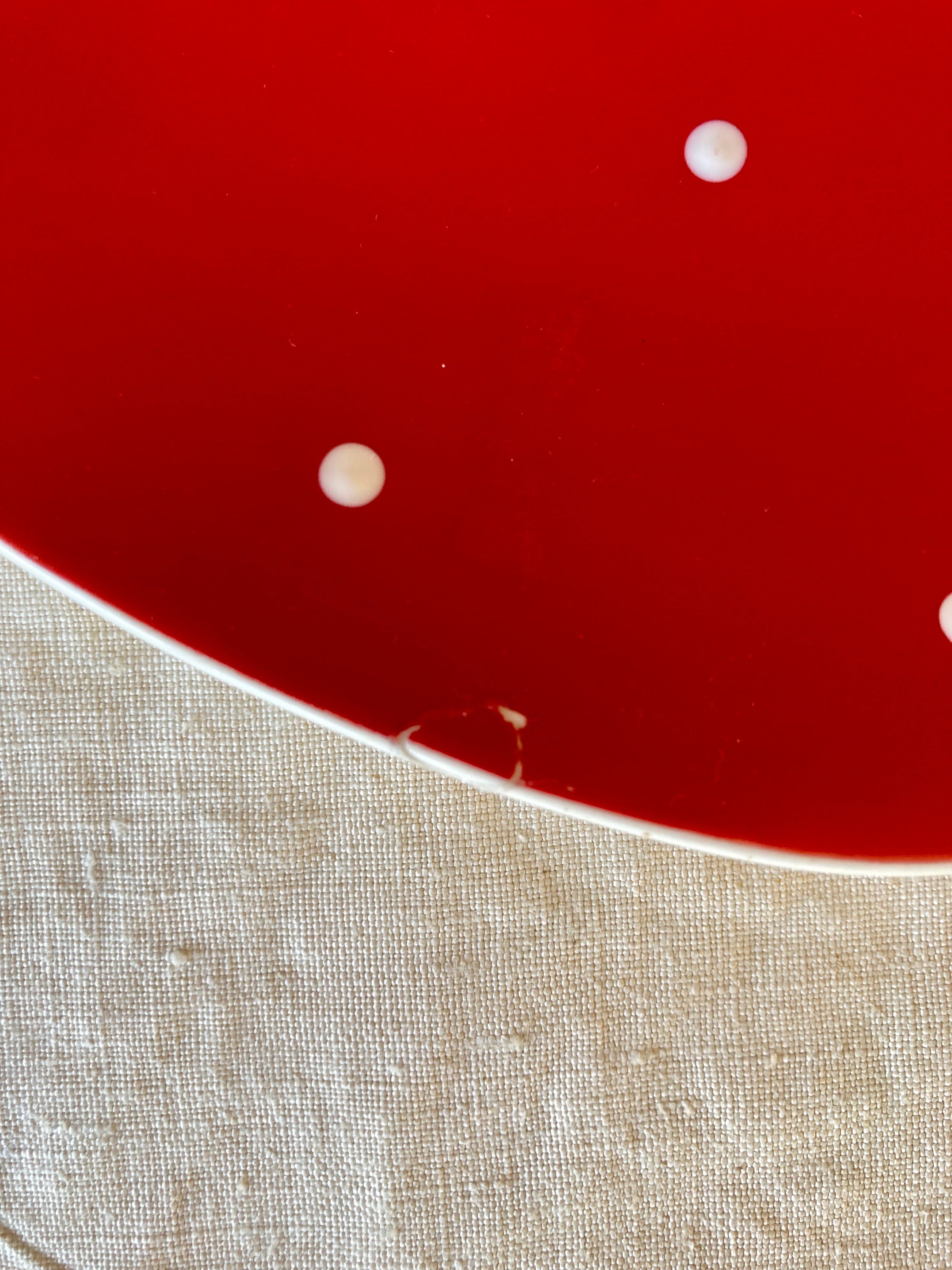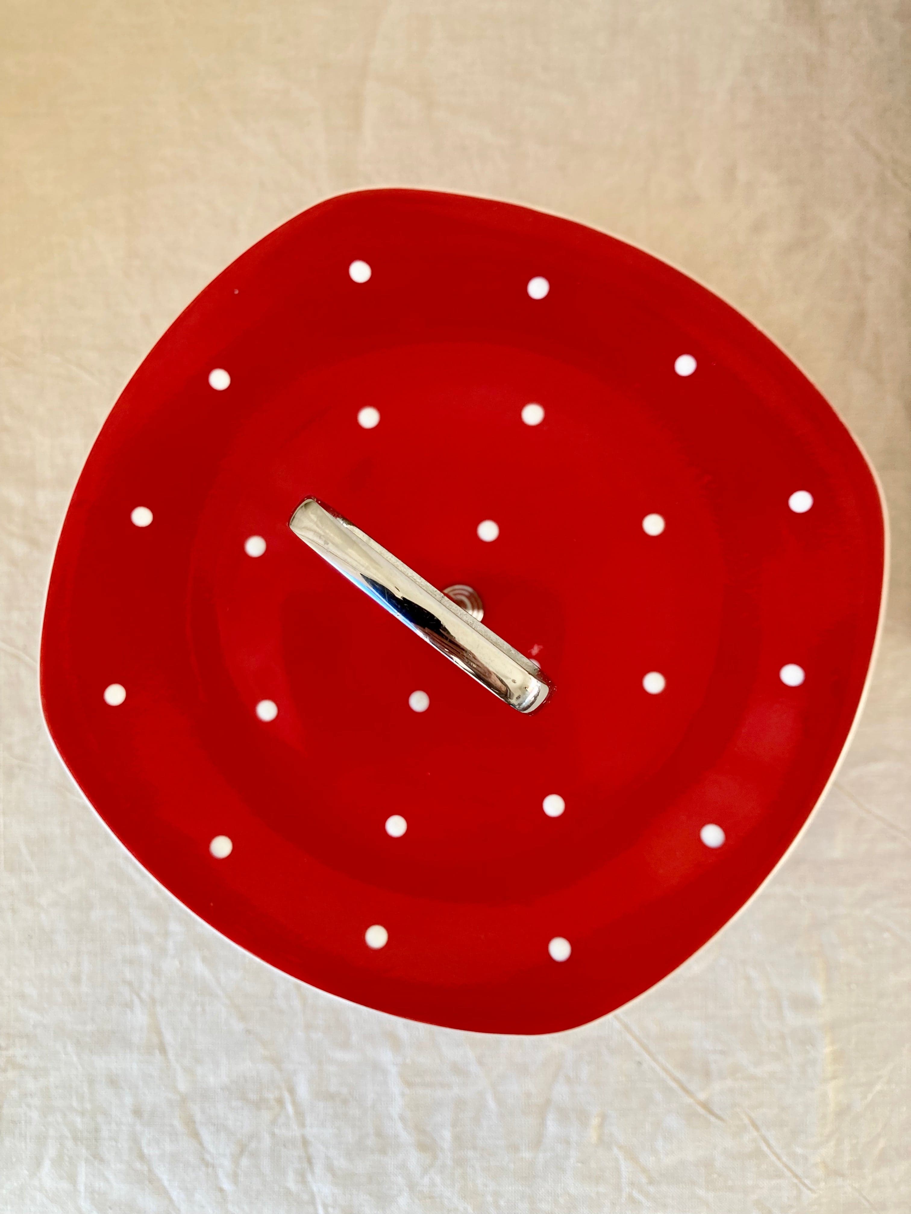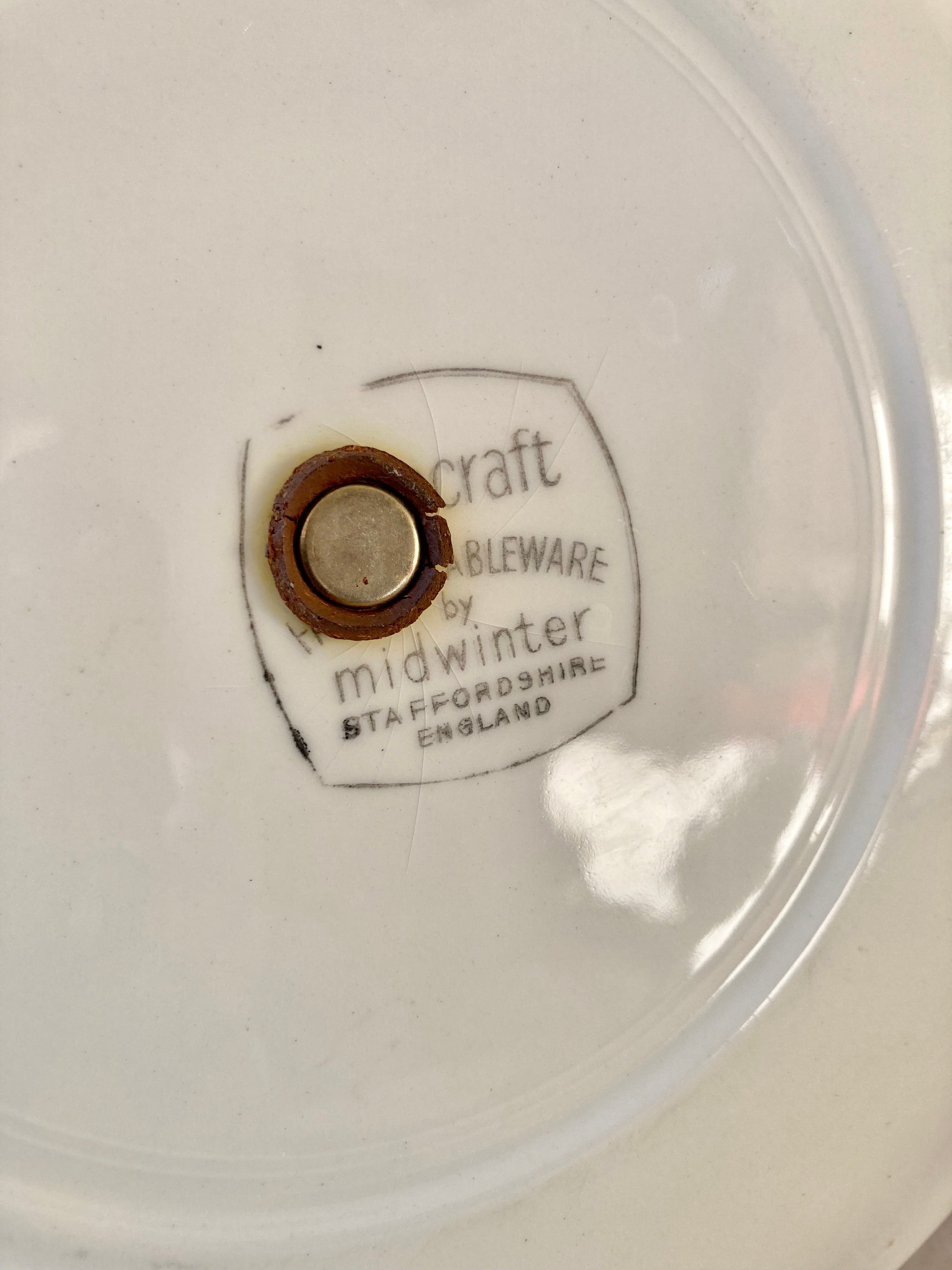This fabulous mid-century cake stand has two tiers and is perfect for Easter treats or summer tea in the garden. Produced by Midwinter of Staffordshire.Dimensions: height 25cm to top of handle, top plate diameter approx. 22cm, bottom plate diameter 25cm. The lower plate has a small shallow chip to the edge which has been mended. It was too lovely to leave behind so price reflects damage. Please look carefully at images which form part of description. Maker's mark on base.