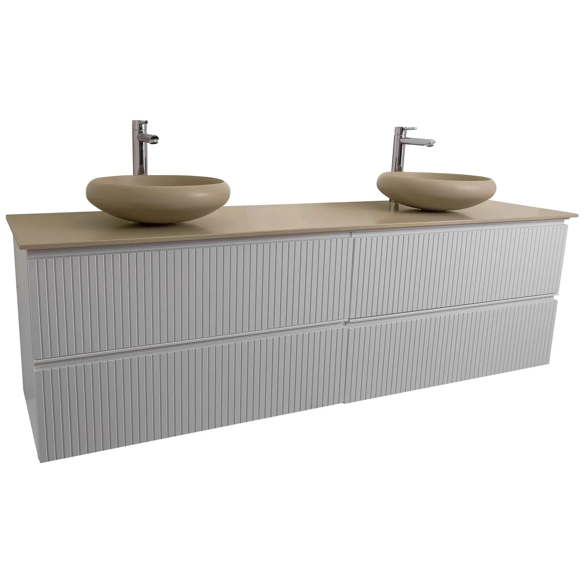 Ares 63 Matte White Cabinet, Solid Surface Flat Taupe Counter And Two Round Solid Surface Taupe Basin 1153, Wall Mounted Modern Vanity Set