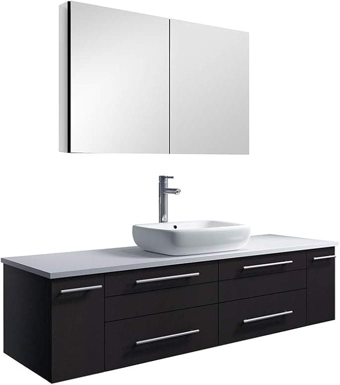 Classically simple with clean lines and a beautiful vessel sink, this Fresca Lucera Wall Hung Modern Bathroom Vanity will bring out the best in any bathroom. Measuring 60” in width, this sophisticated vanity has a well constructed solid wood frame with two roomy storage compartments for holding bathroom essentials and four spacious drawers with a decorative beveled drawer plate design. The doors and drawers are soft-closing and feature slim brushed metal handles. This modern vanity has a chic painted Espresso finish. Gracing the top of the vanity is a striking quartz stone countertop with a white vessel sink. The sink is equipped with an integrated overflow and comes with a single hole vessel faucet, p-trap, pop-up drain and installation hardware. This vanity comes with a Fresca 40” Bathroom Medicine Cabinet. The medicine cabinet features mirrors on the front, along the edges and also on the interior. Two tempered glass shelves provide great storage space.