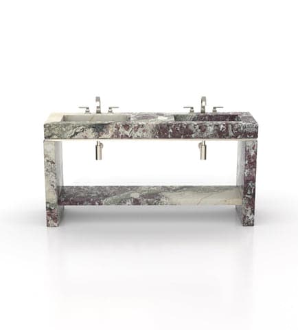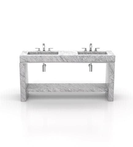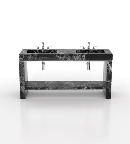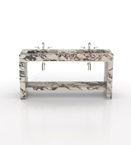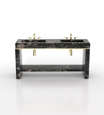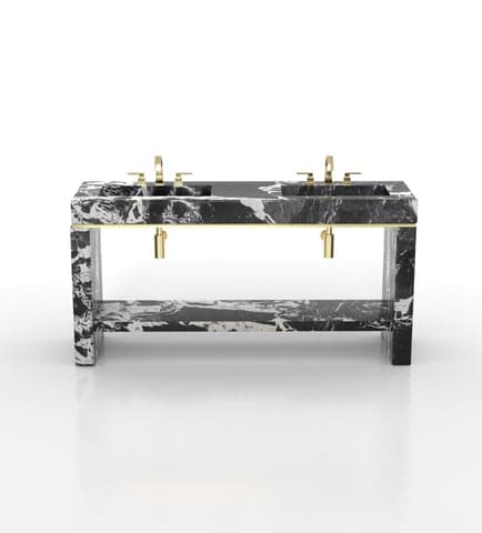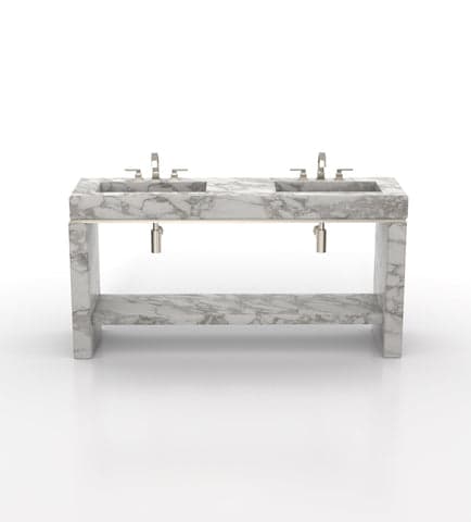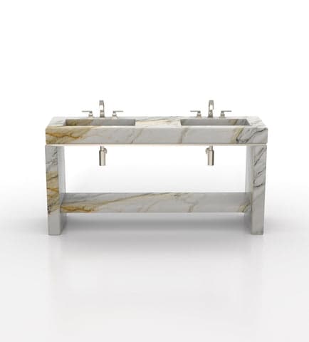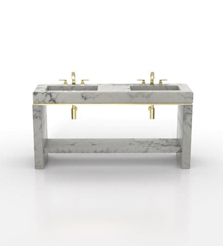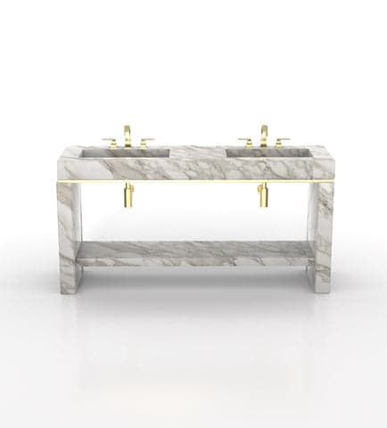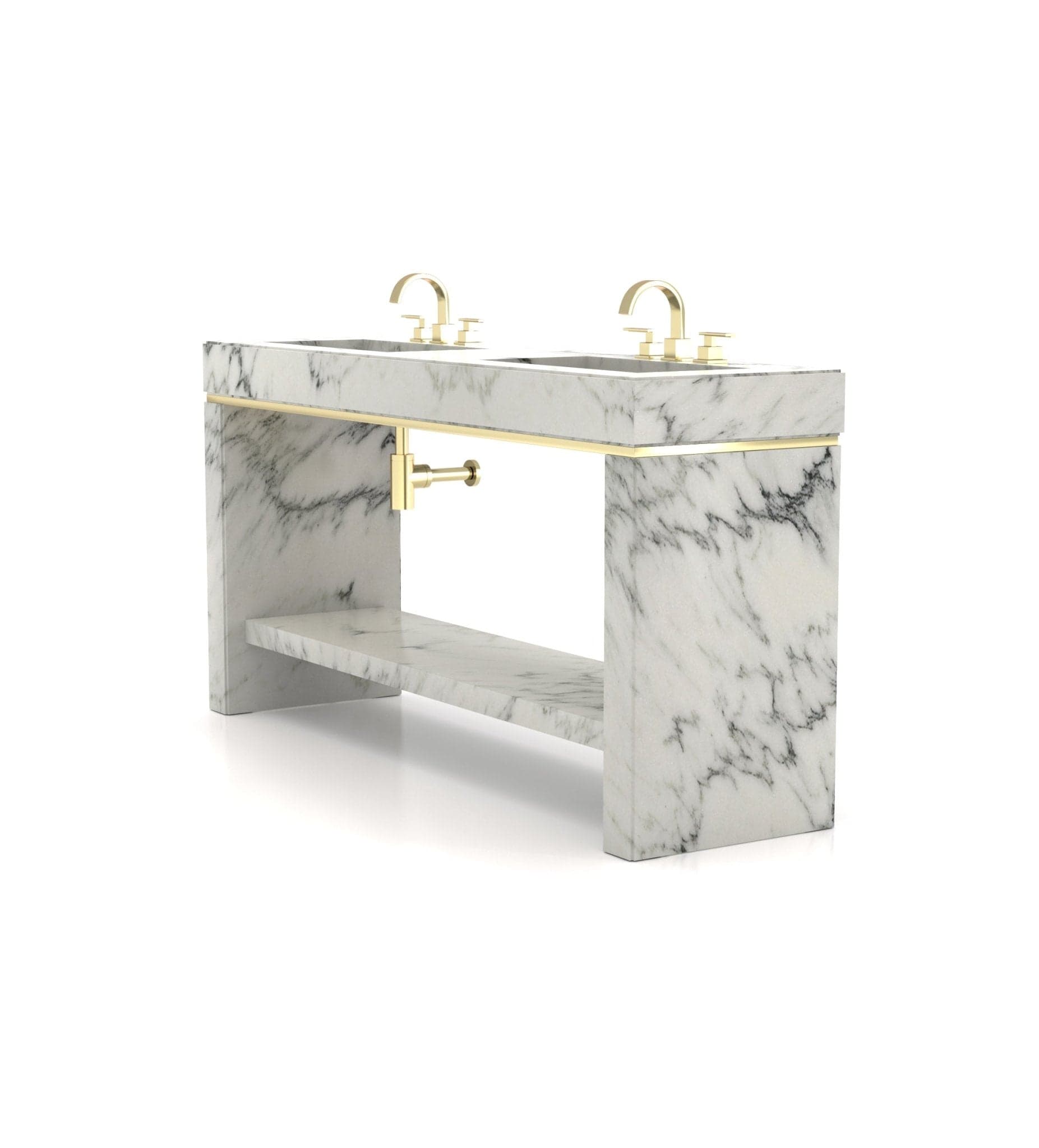 The Joy 71 Pedestal Sink in the Marble Couture line balances artistry and functionality. Its sleek lines and precise geometry epitomize modern elegance, while polished surfaces highlight the natural beauty of premium stone. With recessed angles and accents of polished aluminum, satin nickel, and luminous brass, this sink exudes an opulent and sophisticated aura.