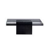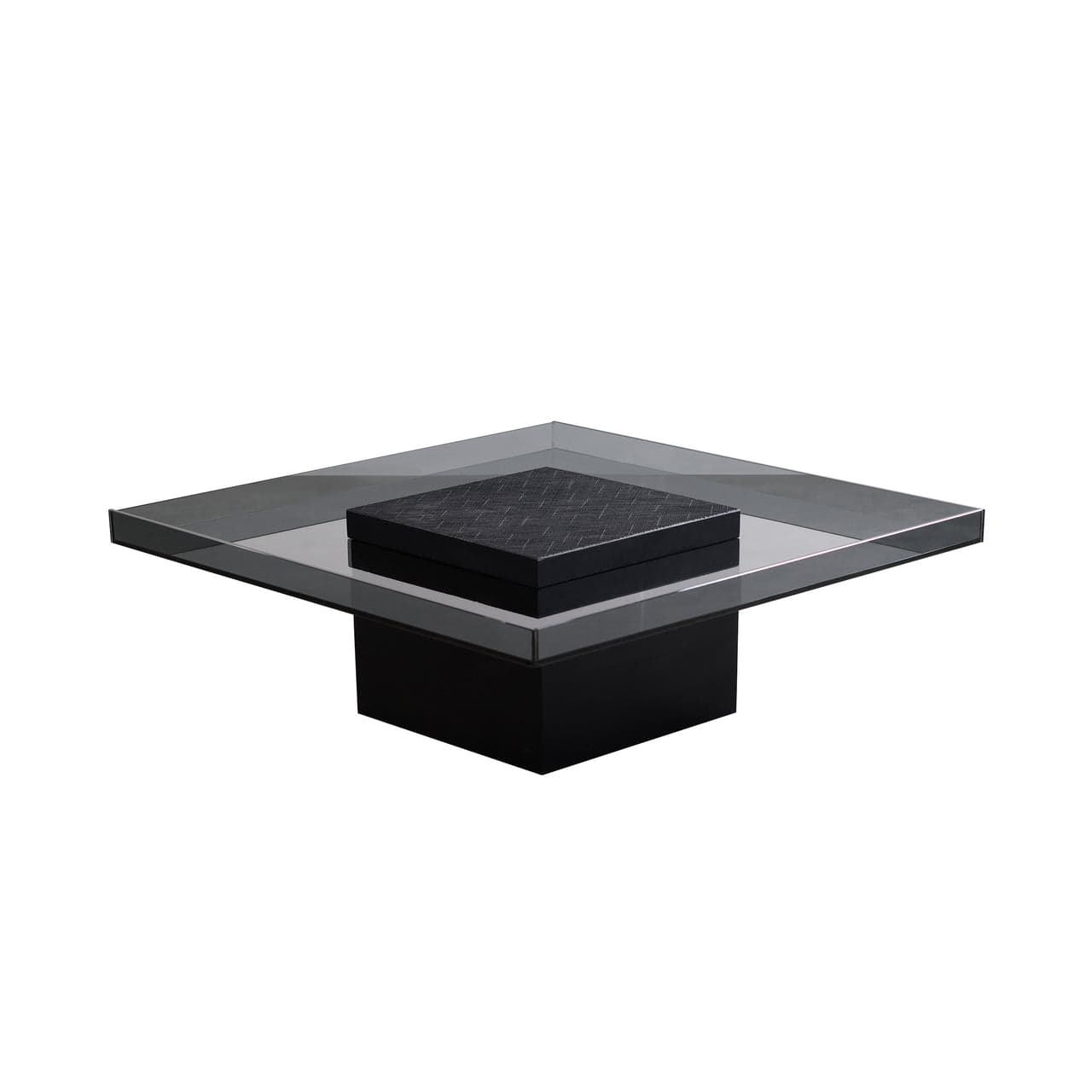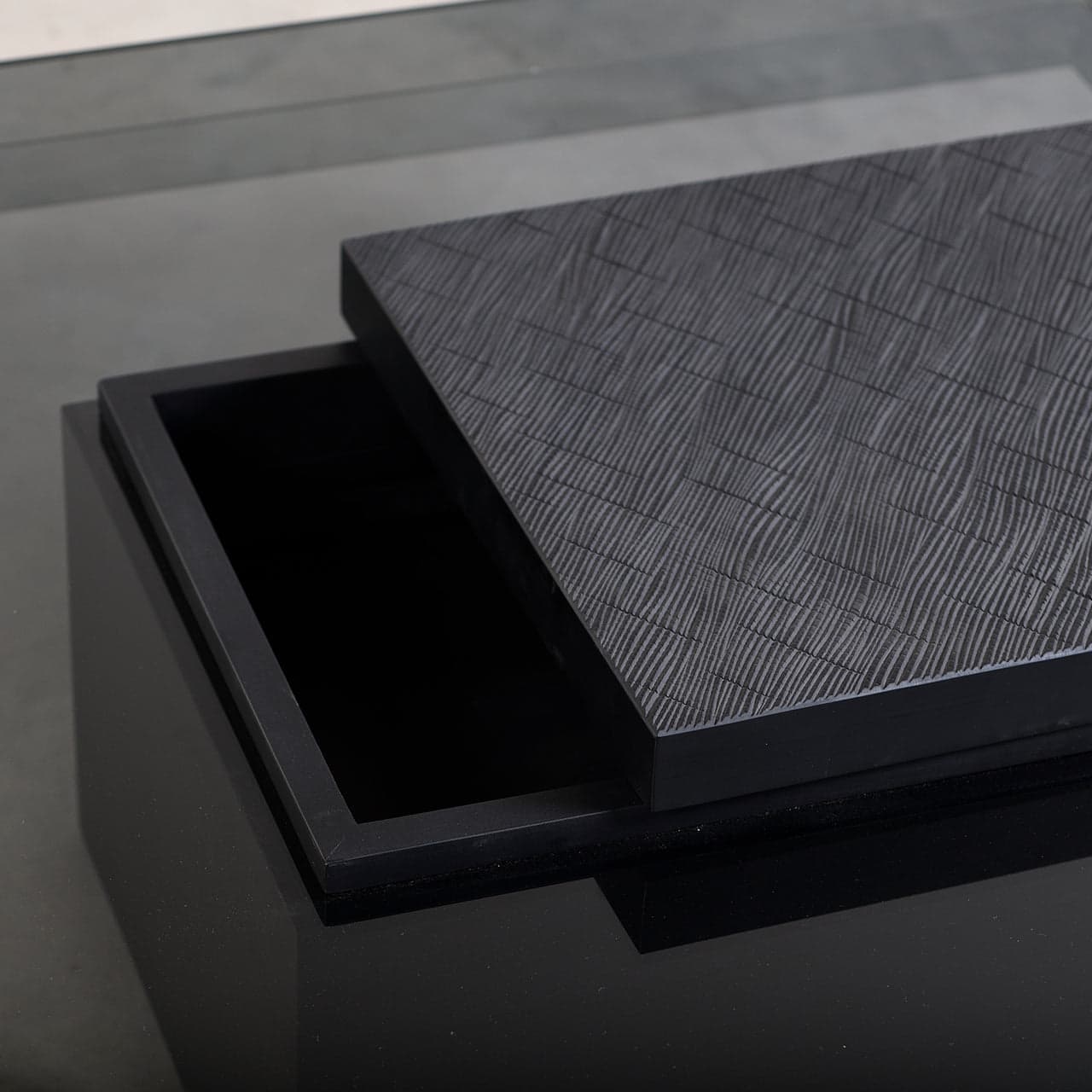 In this boldly scaled square version, Koba combines the sleekness of glass and the warmth and tactility of solid wood with a hand-carved flourish. French designer Jean-Marie Massaud’s coffee table features a central cube base in matte-finish, black-stained maple that squarely intersects a smoked glass tabletop, framed around the edges. Lifting the carved central section’s lid, with its texture reminiscent of burnt wood, reveals a storage compartment while the base also contains an easily accessible “secret” space.