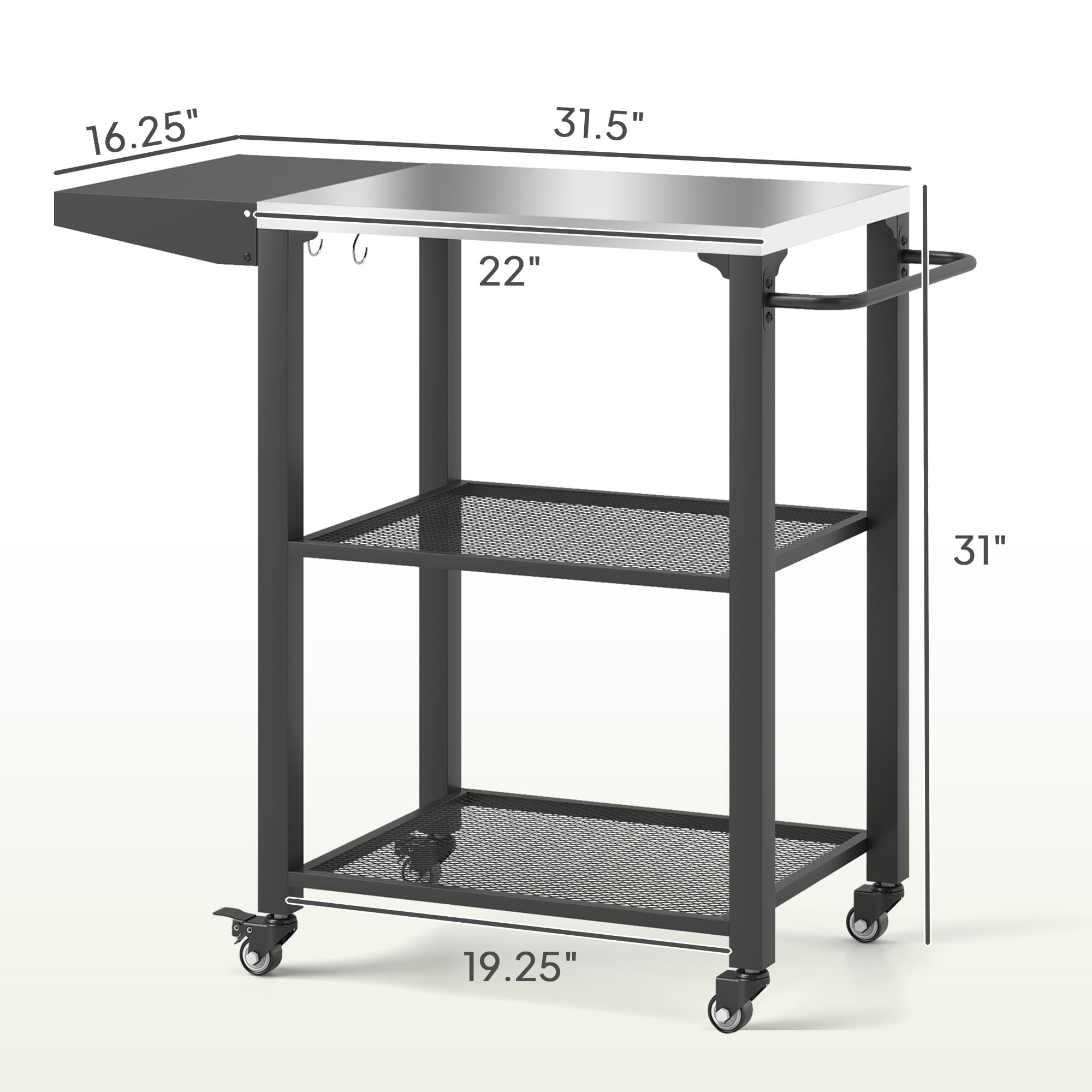 Outsunny Three-Shelf Outdoor Grill Cart Table with Foldable Side Table, Stainless Steel Top Pizza Oven Stand with Hooks, Silver
