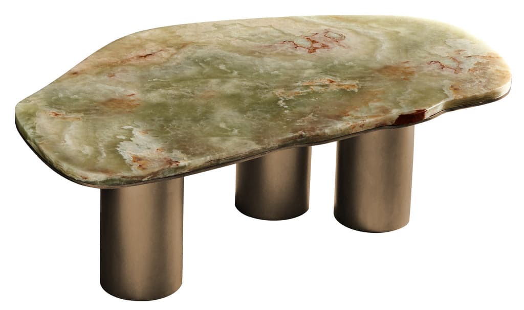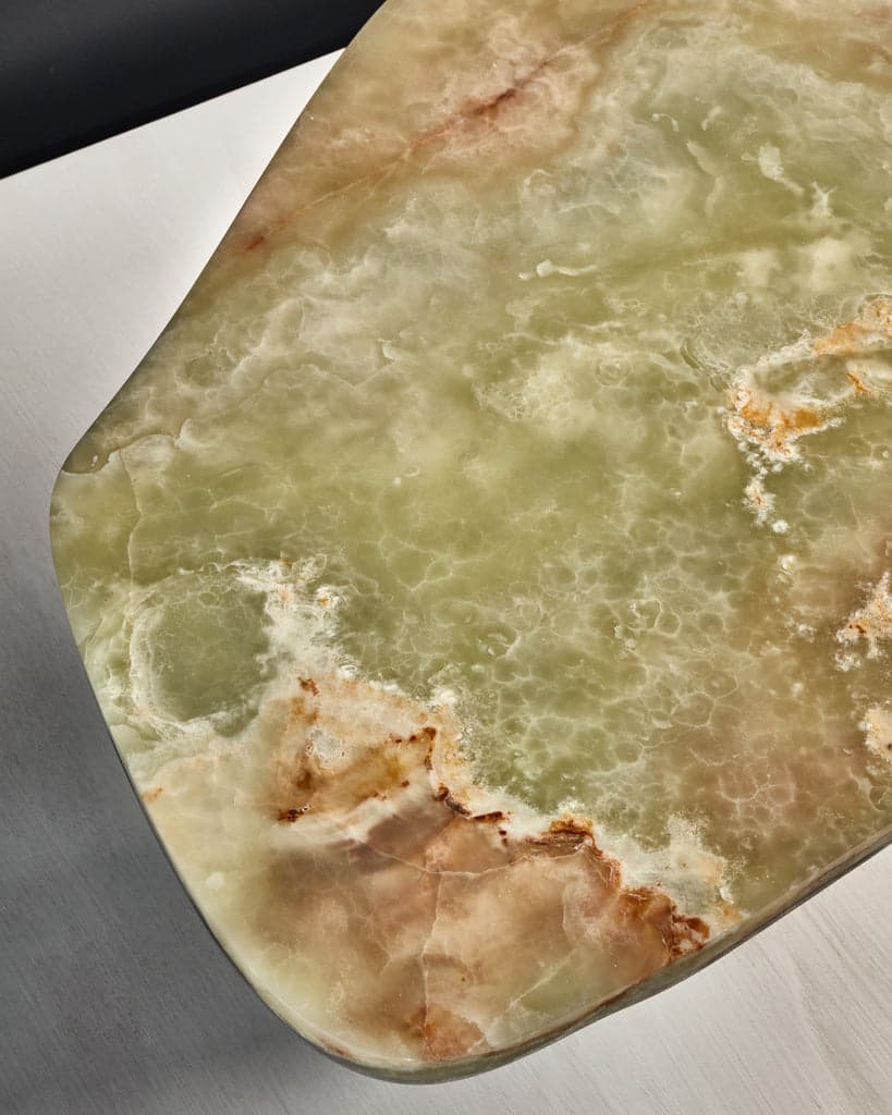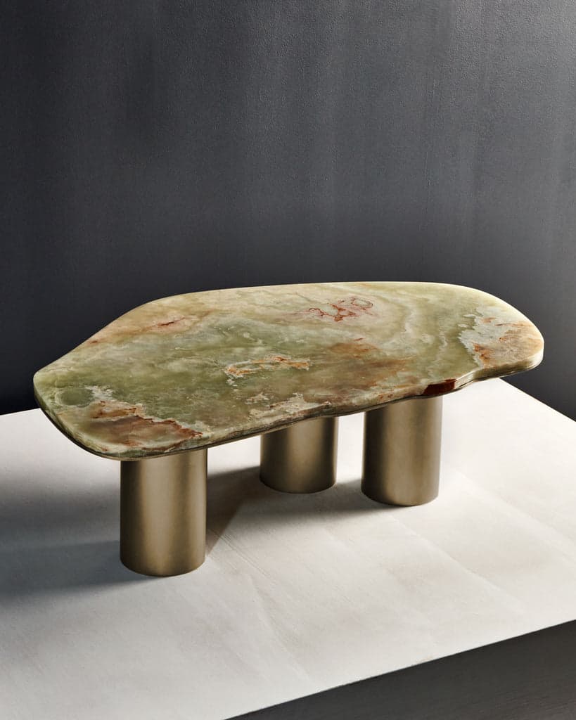 Celebrating nature's inherent beauty, the Oni Coffee Table embraces the beauty of stone's natural veining. The Green Onyx top is elegantly supported by a brush-finished and hand-waxed brass base and playfully asymmetric legs that explore harmony and balance through proportions. The base can be brushed or antiqued brass. The Oni Coffee Table is available in two sizes which can nest to create a dynamic larger assemblage.