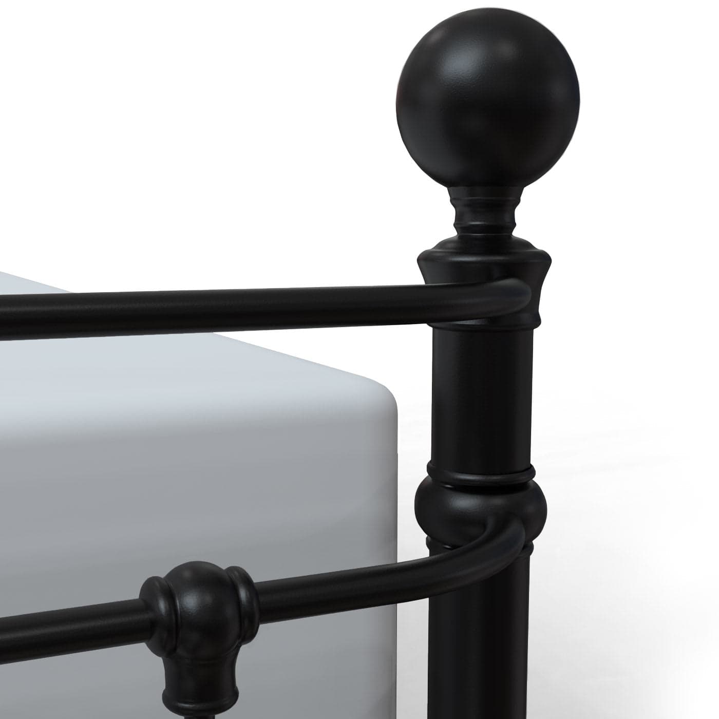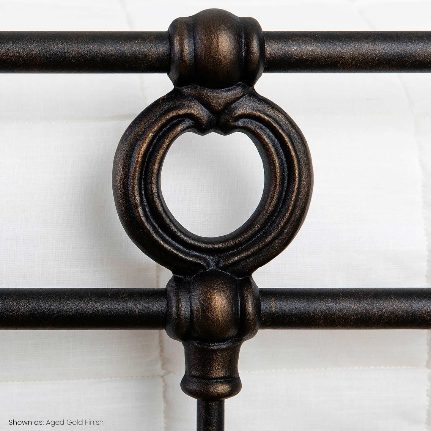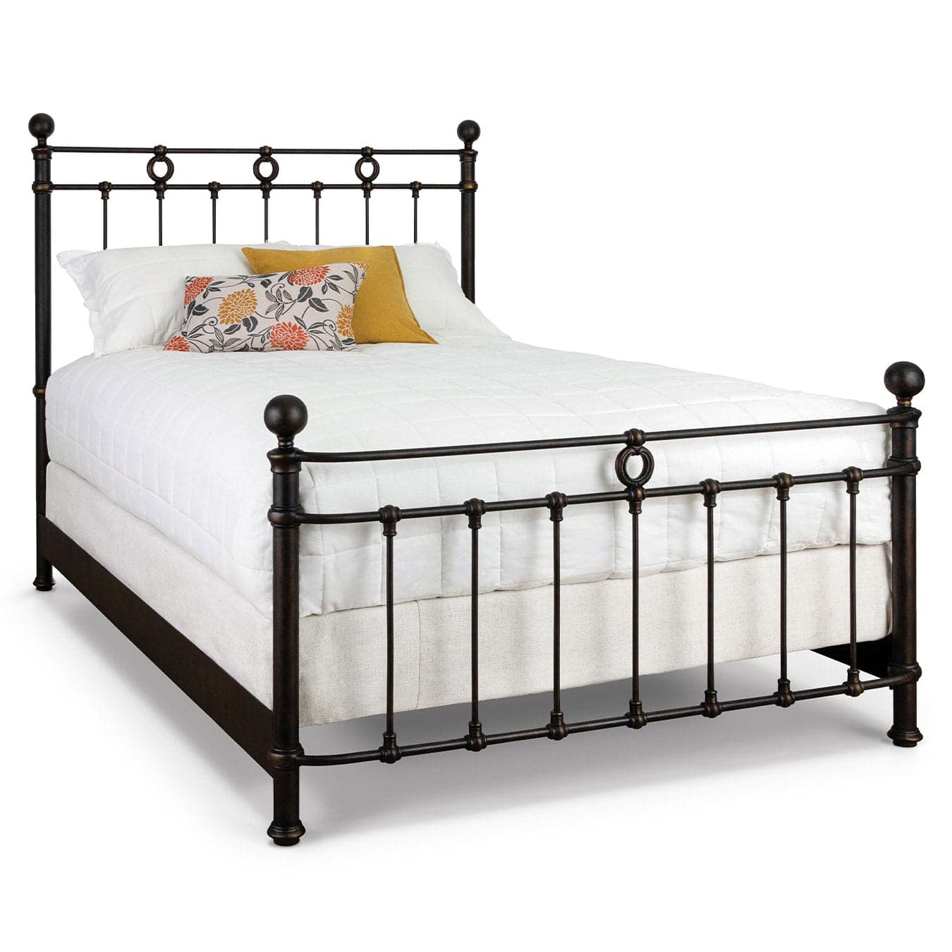 The contoured shelter footboard on the Latif Iron Bed by Wesley Allen creates a timeless look. Balancing clean line spindles with the elegant simple medallions, Wesley Allen's Latif Iron Bed is luxury interior design furniture with hand forged wrought iron and hand poured castings. The complete bed comes with our custom heavy duty frame for use with a regular box spring or adjustable bed. Choose from over 30 custom finishes. The Latif Iron Bed by Wesley Allen will add timeless luxury to your bedroom. Handcrafted by skilled artisans and fully welded for added strength, its high-end wrought iron frame is both sturdy and stylish. Finished in over 30 powder coat paints, the Latif is built to last, backed by a lifetime warranty, and promises to become a cherished family heirloom.