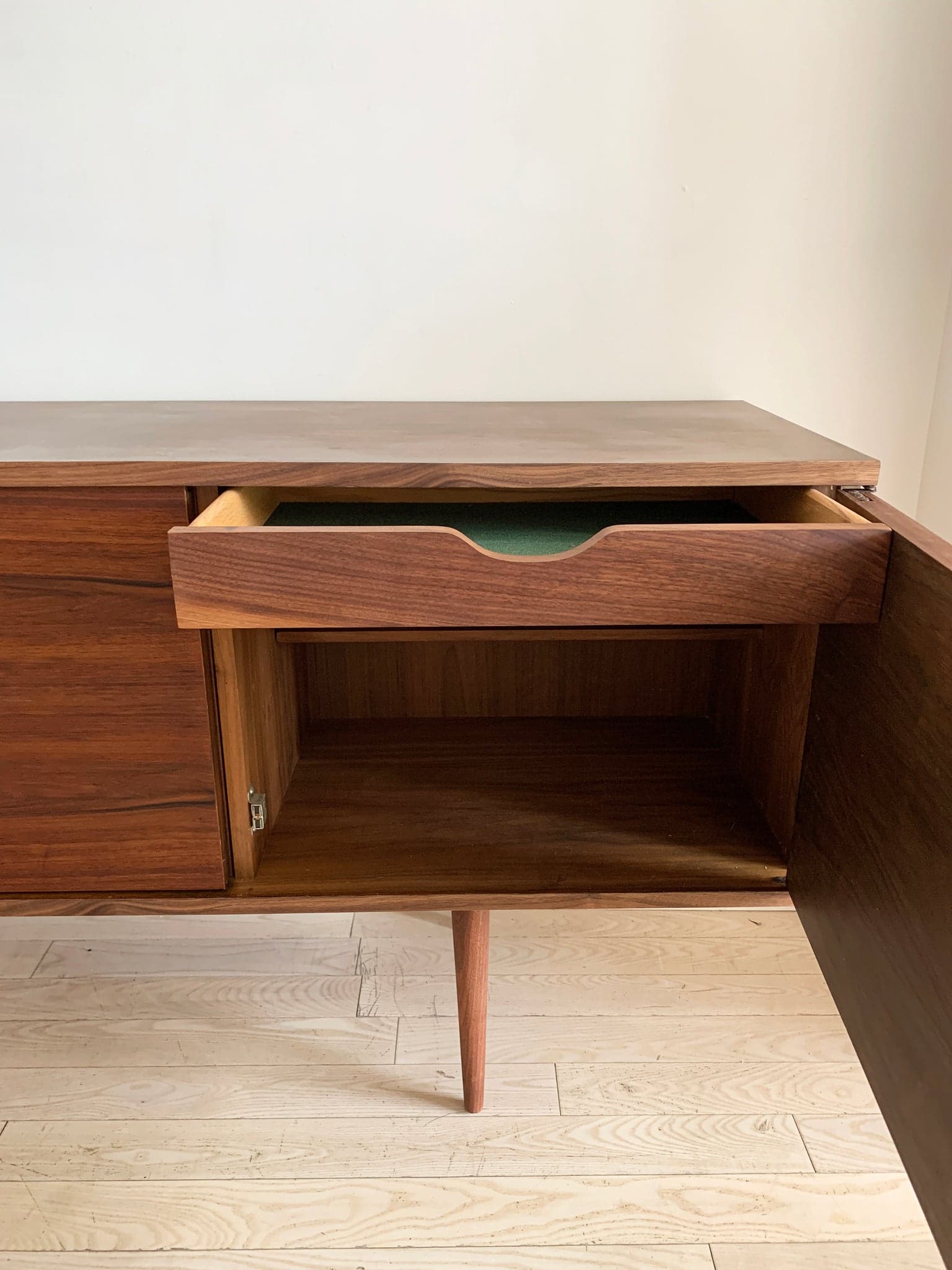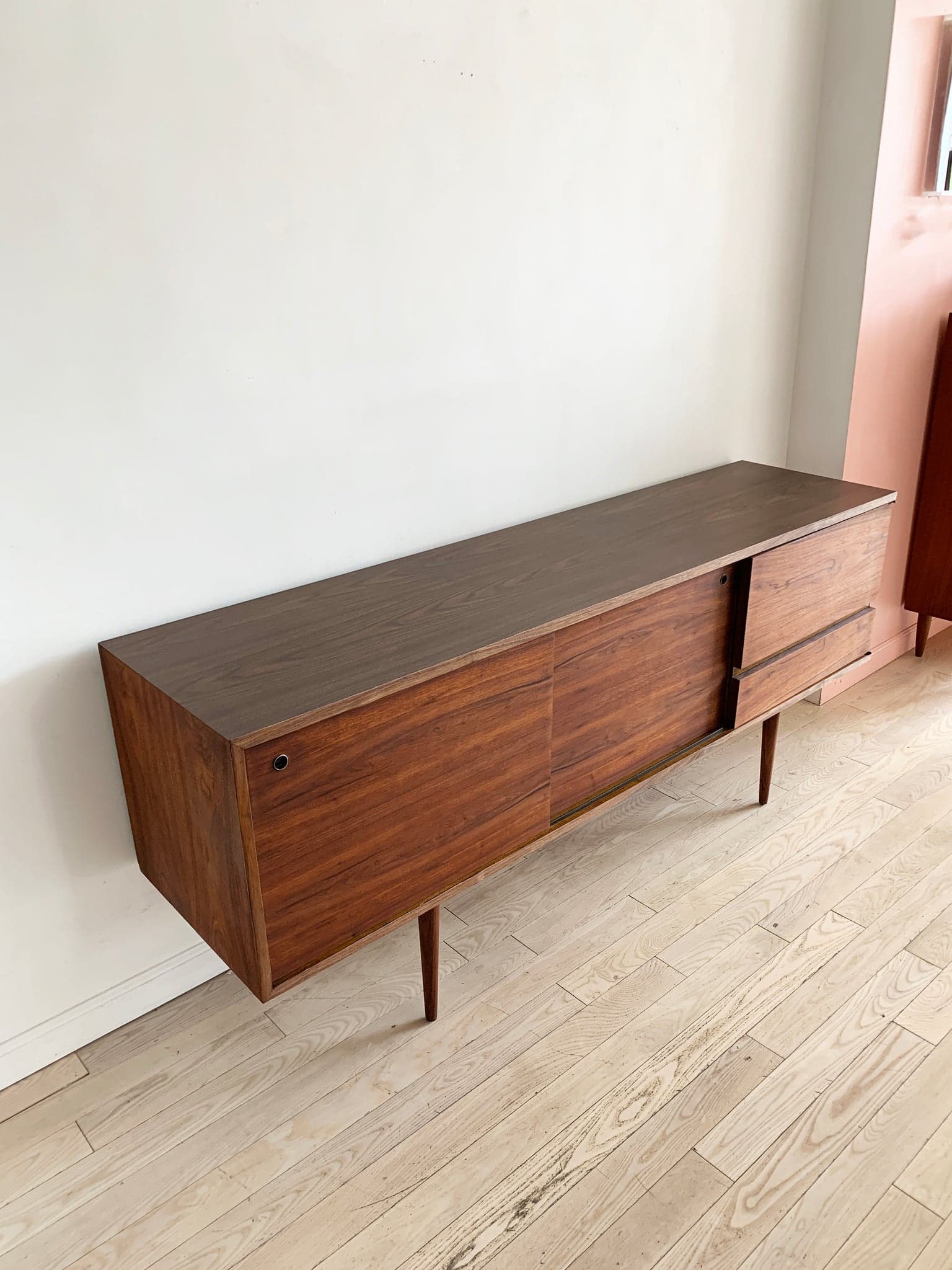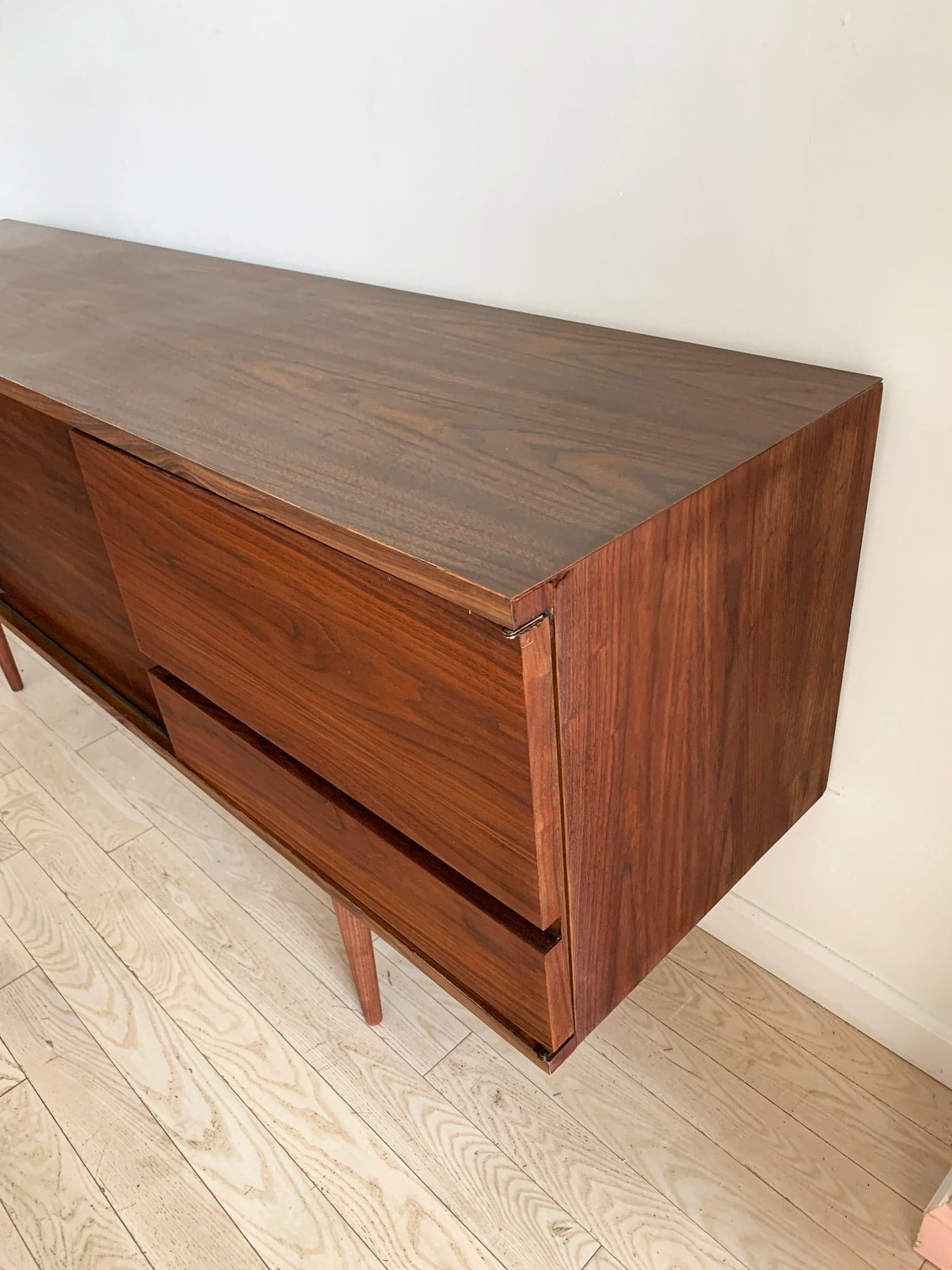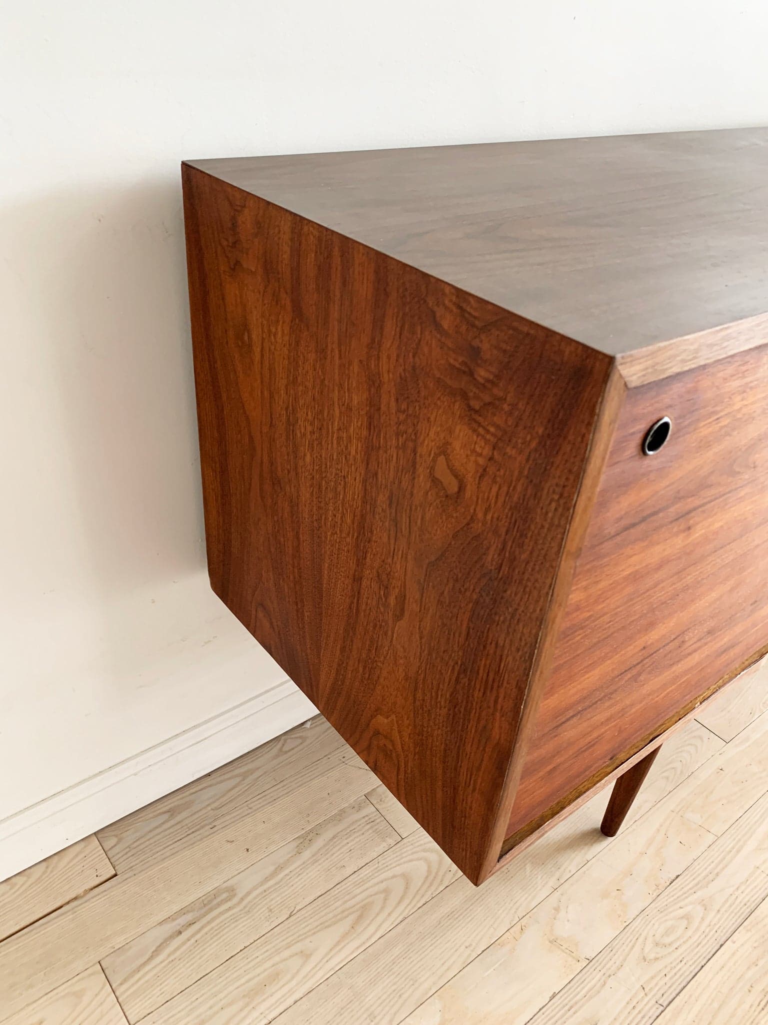 1950s walnut credenza by Mel Smilow. Original laminate top. Sliding door cabinets with adjustable shelves inside. Pull open cabinet with drawer and adjustable shelf. This piece has been refinished. Metal circle pulls. Solid walnut peg legs. This pieces also comes with a French cleat if you wish to hang to have a floating credenza. The legs twist right off and easy to install. 72" wide x 18" deep x 30.5" tall.