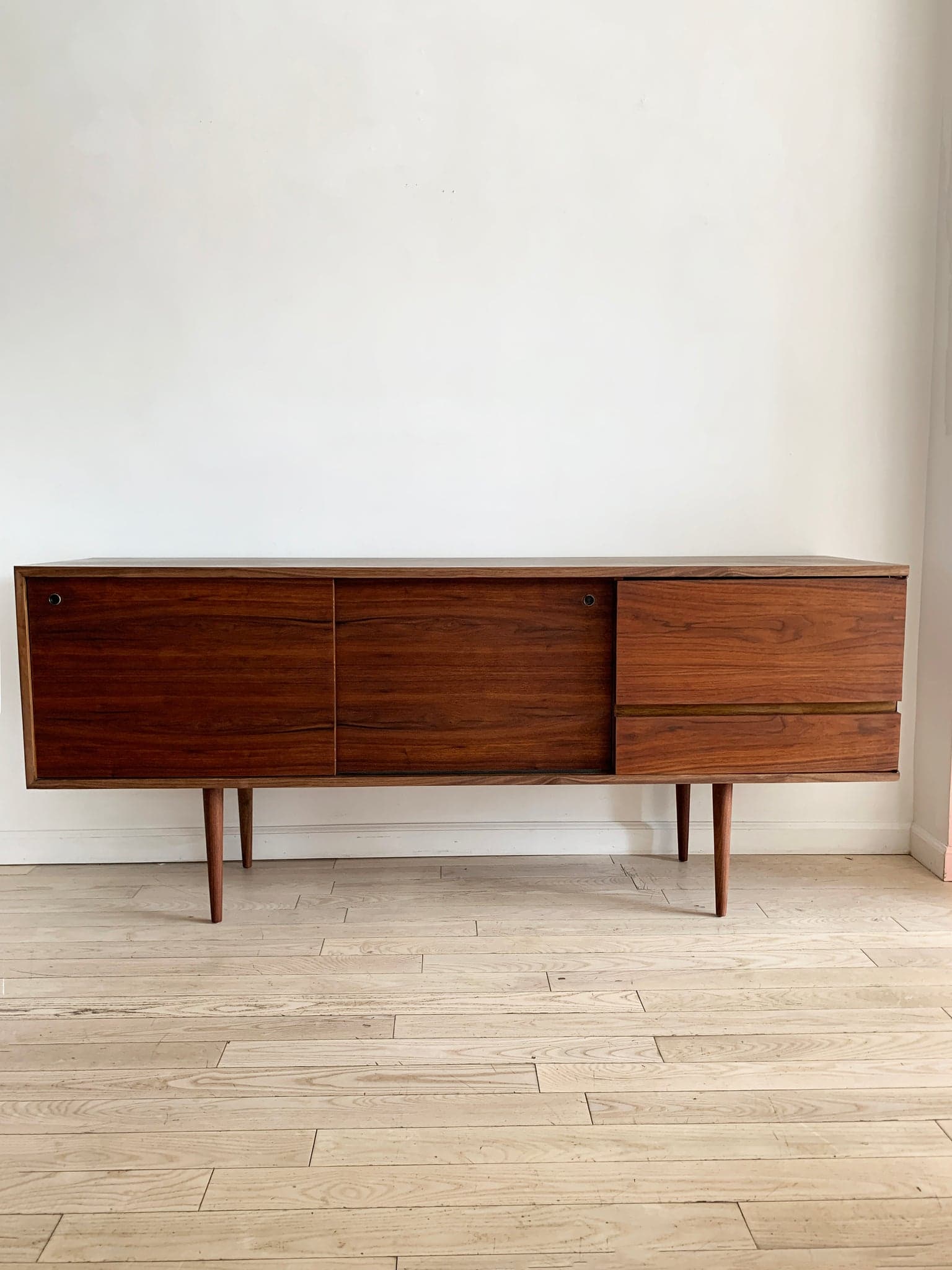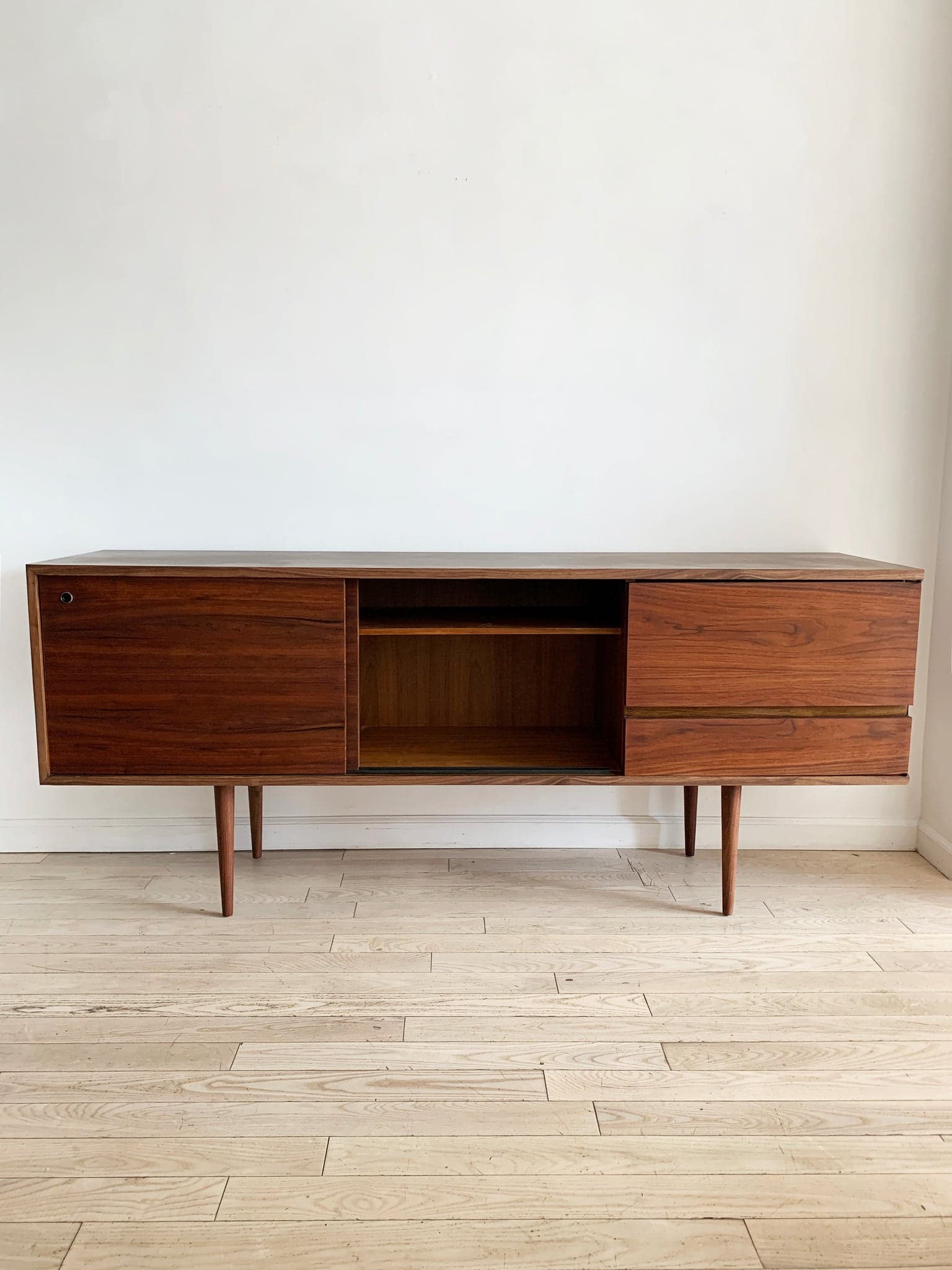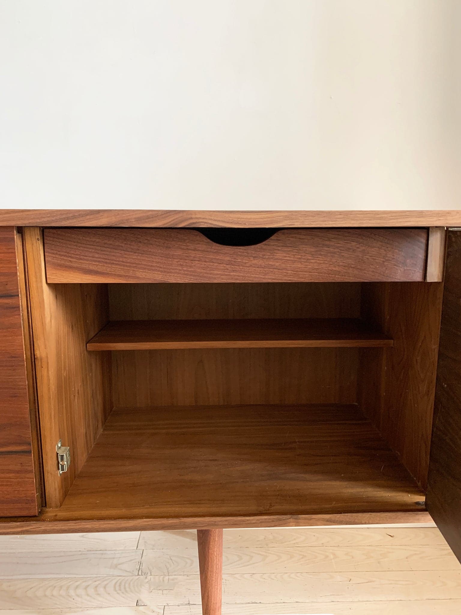 1950s walnut credenza by Mel Smilow. Original laminate top. Sliding door cabinets with adjustable shelves inside. Pull open cabinet with drawer and adjustable shelf. This piece has been refinished. Metal circle pulls. Solid walnut peg legs. This pieces also comes with a French cleat if you wish to hang to have a floating credenza. The legs twist right off and easy to install. 72" wide x 18" deep x 30.5" tall.