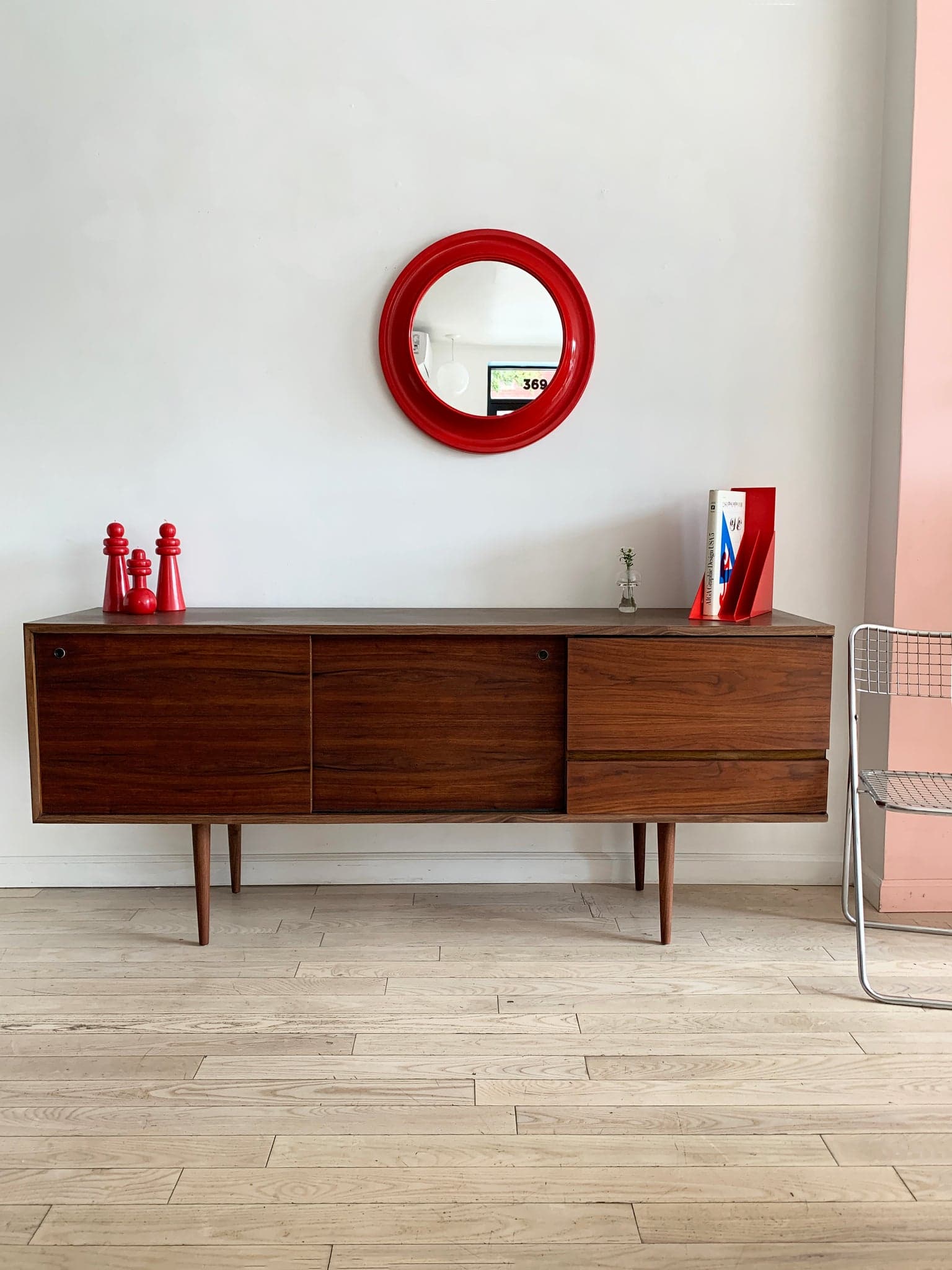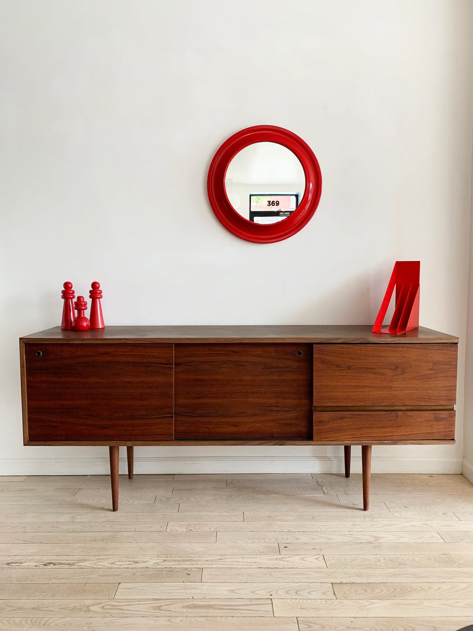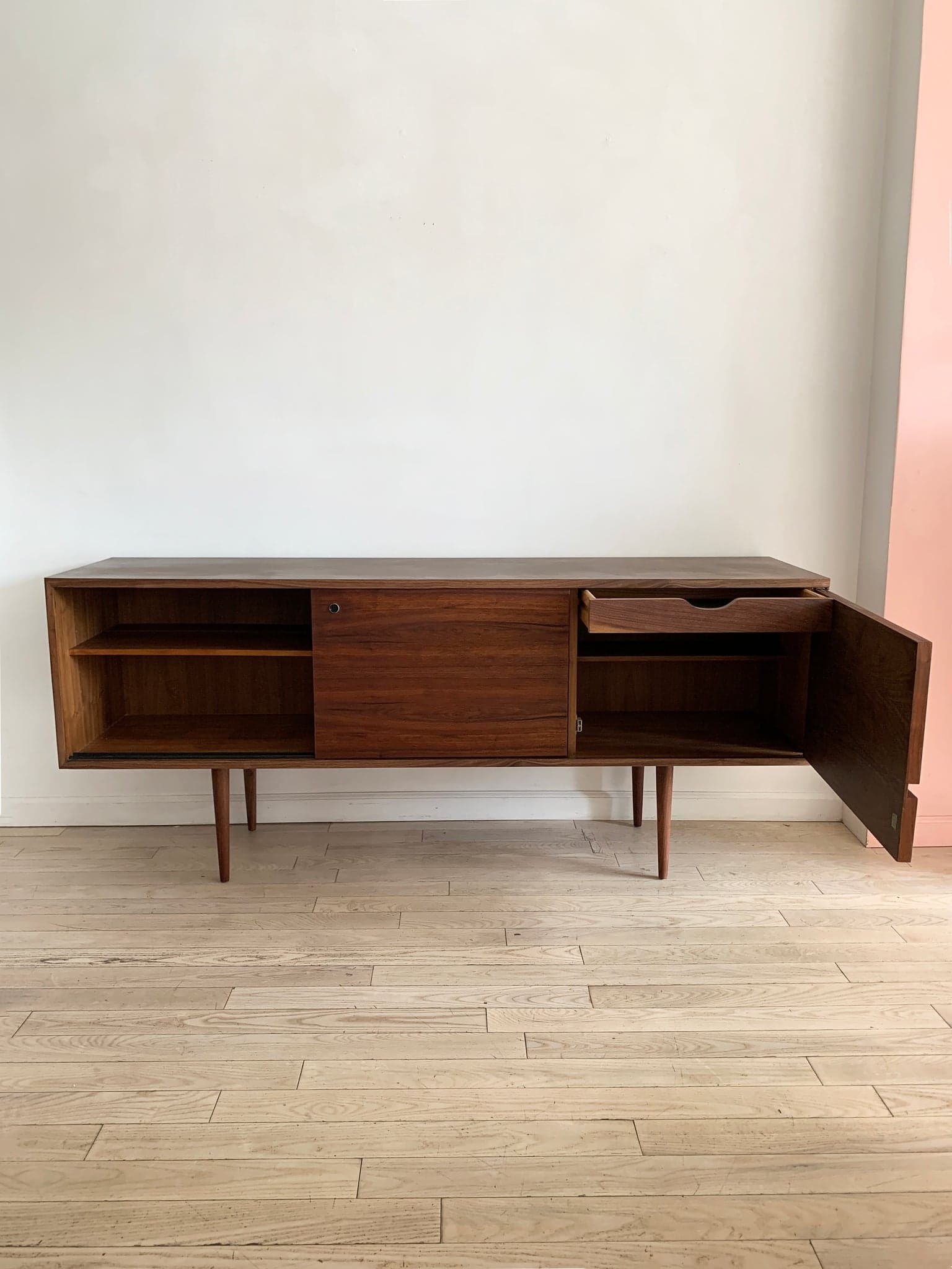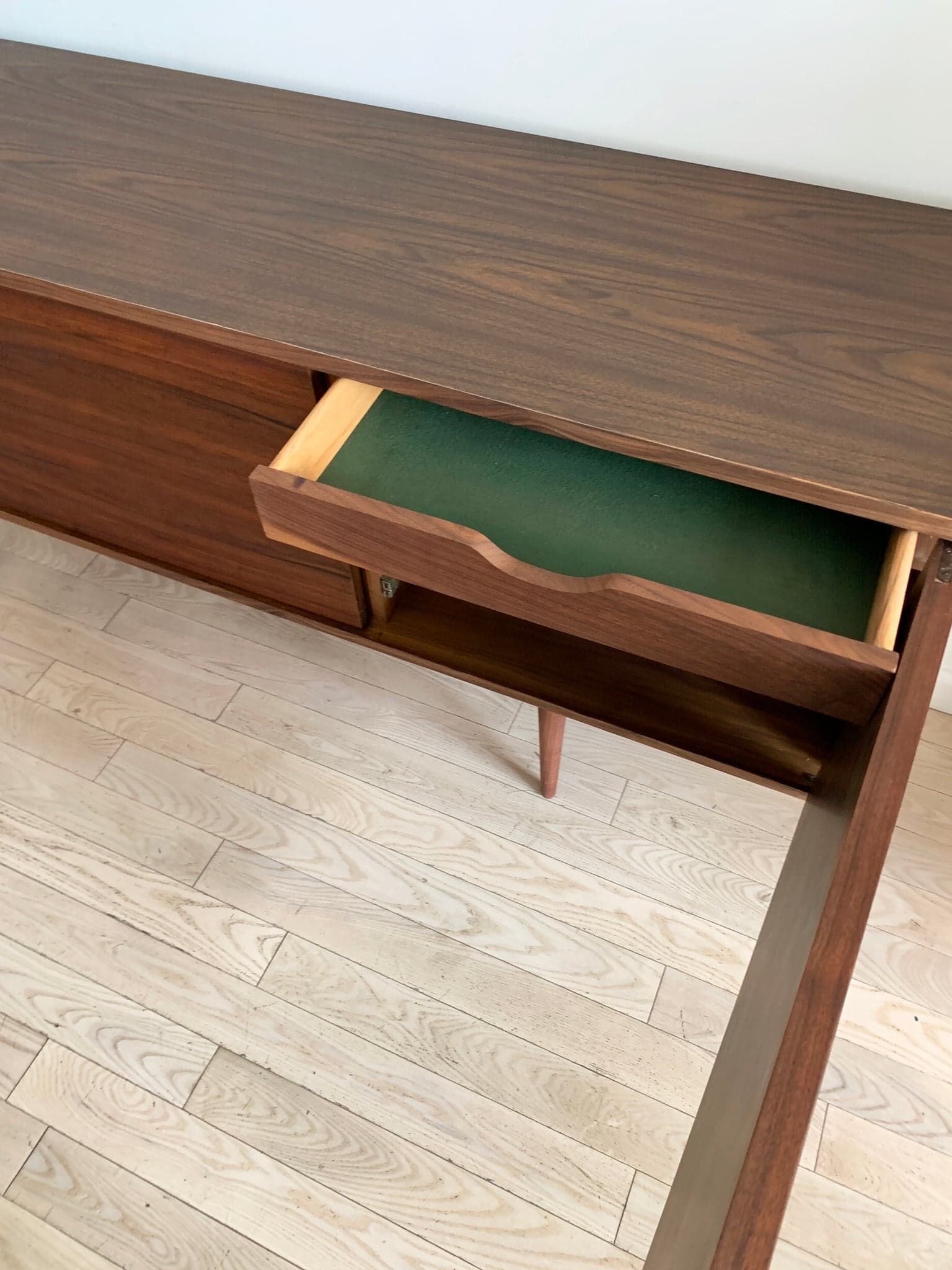 1950s walnut credenza by Mel Smilow. Original laminate top. Sliding door cabinets with adjustable shelves inside. Pull open cabinet with drawer and adjustable shelf. This piece has been refinished. Metal circle pulls. Solid walnut peg legs. This pieces also comes with a French cleat if you wish to hang to have a floating credenza. The legs twist right off and easy to install. 72" wide x 18" deep x 30.5" tall.