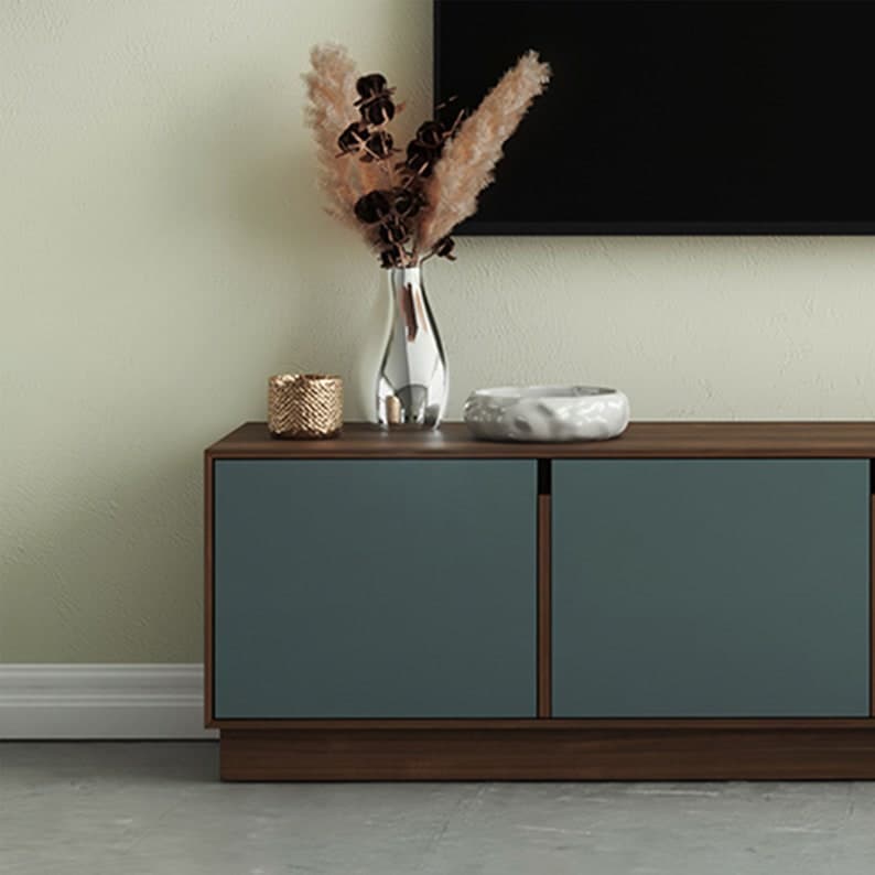 The Gibson TV Unit is an elegant, stylish, and sophisticated storage desk, 100% handmade and manufactured in the UK. Designed with style in mind, this piece has a unique opening mechanism with a curved shape for easy door opening. The cabinet includes 4 large doors opening to large storage spaces. Made from high-quality oak or walnut real wood veneer, lacquered for a perfect finish. Available in oak and walnut veneer, or black or grey chic. Customizations are available.