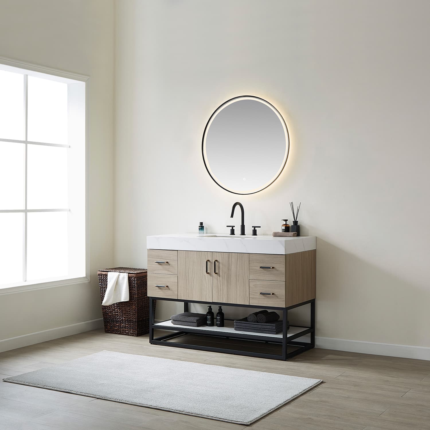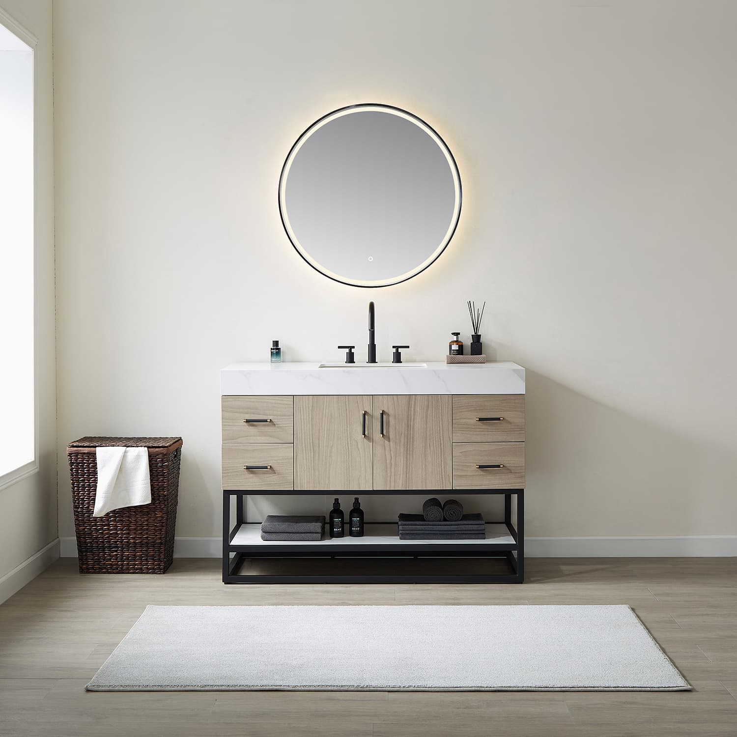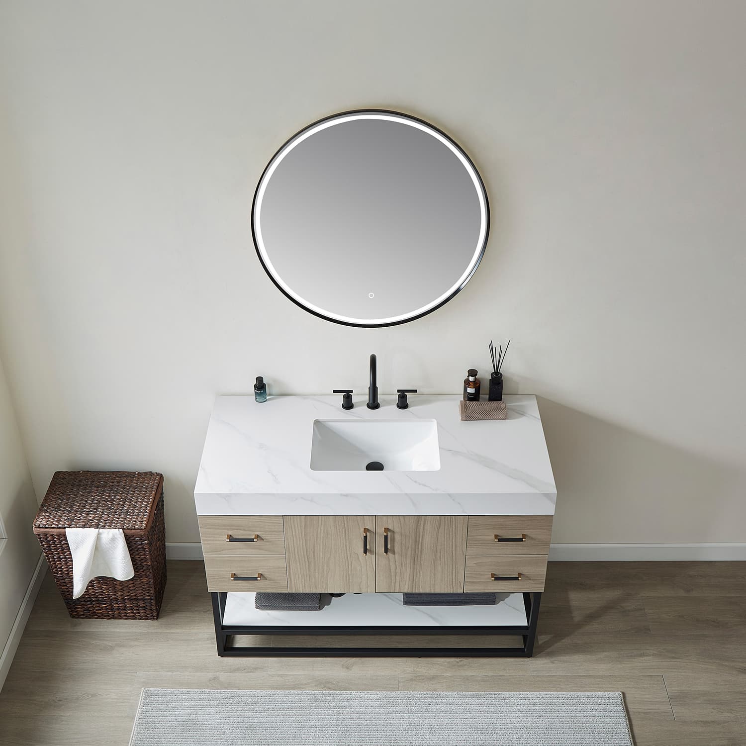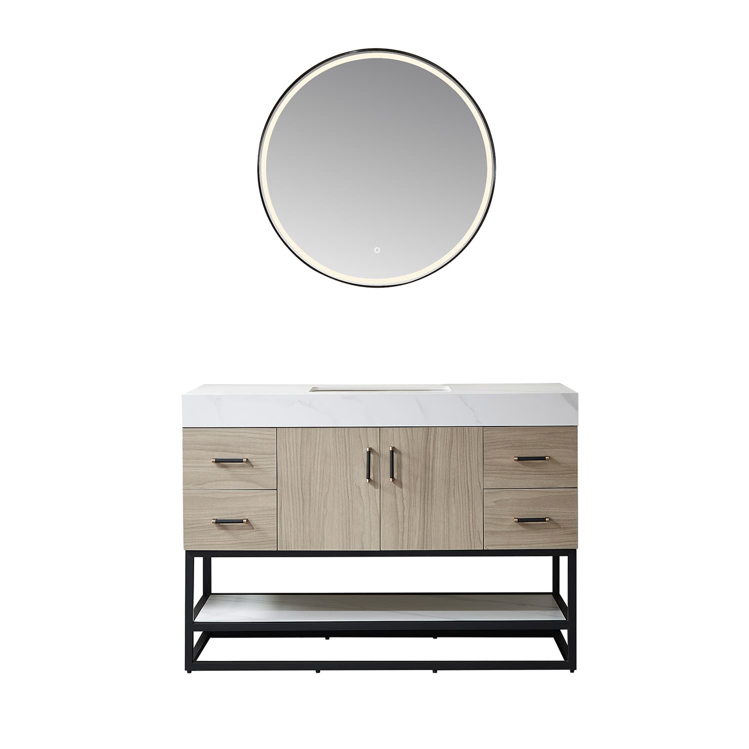 This vanity brings elegance and head-turning style to your modern bathroom space, optioning combination with touch-sensor LED mirror. The cabinets are made of Plywood and Technology moisture-proof board which can protect the beautiful vanity from water damage. Styled with high quality white sintered stone for a contemporary finish. Open shelving down below offers space for towels, toiletries, decorative items, and more. The option of brushed gold or matte black hardware compliments for a perfect opulent finish. Dimension: H 33.1 x W 47.9 x D 21.9" Made of Plywood with Technology Moisture-Proof Board combined Light Walnut or Dark Walnut finish White composite stone sink and top with sintered stone shelving board Single Rectangular integral white composite stone sink with overflow included One soft-closing door Brushed Gold or Matte Black Hardware finish hardware Brushed Gold or Matte Black stainless steel support base with open type fixed shelf Built in UL listed power and USB outlet Single faucet hole, pre-drilled Does not include faucet,drain assembly,or P-trap and backsplash Easy plumbing and faucet installation* Without Mirror
