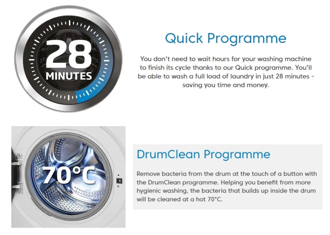 This washing machine features Beko's Quick programme which can wash a large 7kg load in just 28 minutes, as well as a child safety lock for an added peace of mind— perfect for big and busy families as it speeds up your everyday wash! It's also designed with LED progress indicator lights and a slim depth for easier use and installation. Finally, this model includes a hand-wash programme for your delicate clothing pieces!