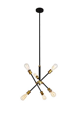 Modern sophistication with a jaunty presentation. This Axel pendant features three adjustable crossing arms mounted on a central rod to direct light in any direction. A total of six light sources (bulbs not included) in a compact design offers functional beauty in smaller spaces. The absence of shades says industrial; the design says penthouse. The smooth steel hardware is finished in austere black with soft bronze sockets and canopy, adding a bit of tradition. Stylish and cutting-edge without being too eccentric.