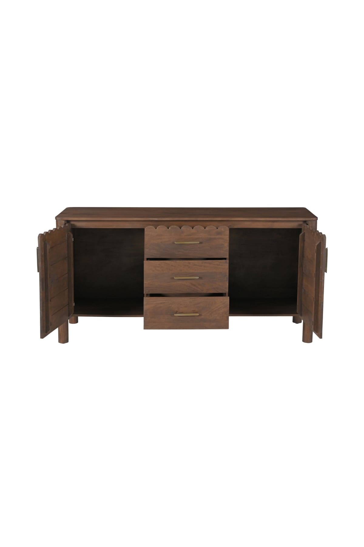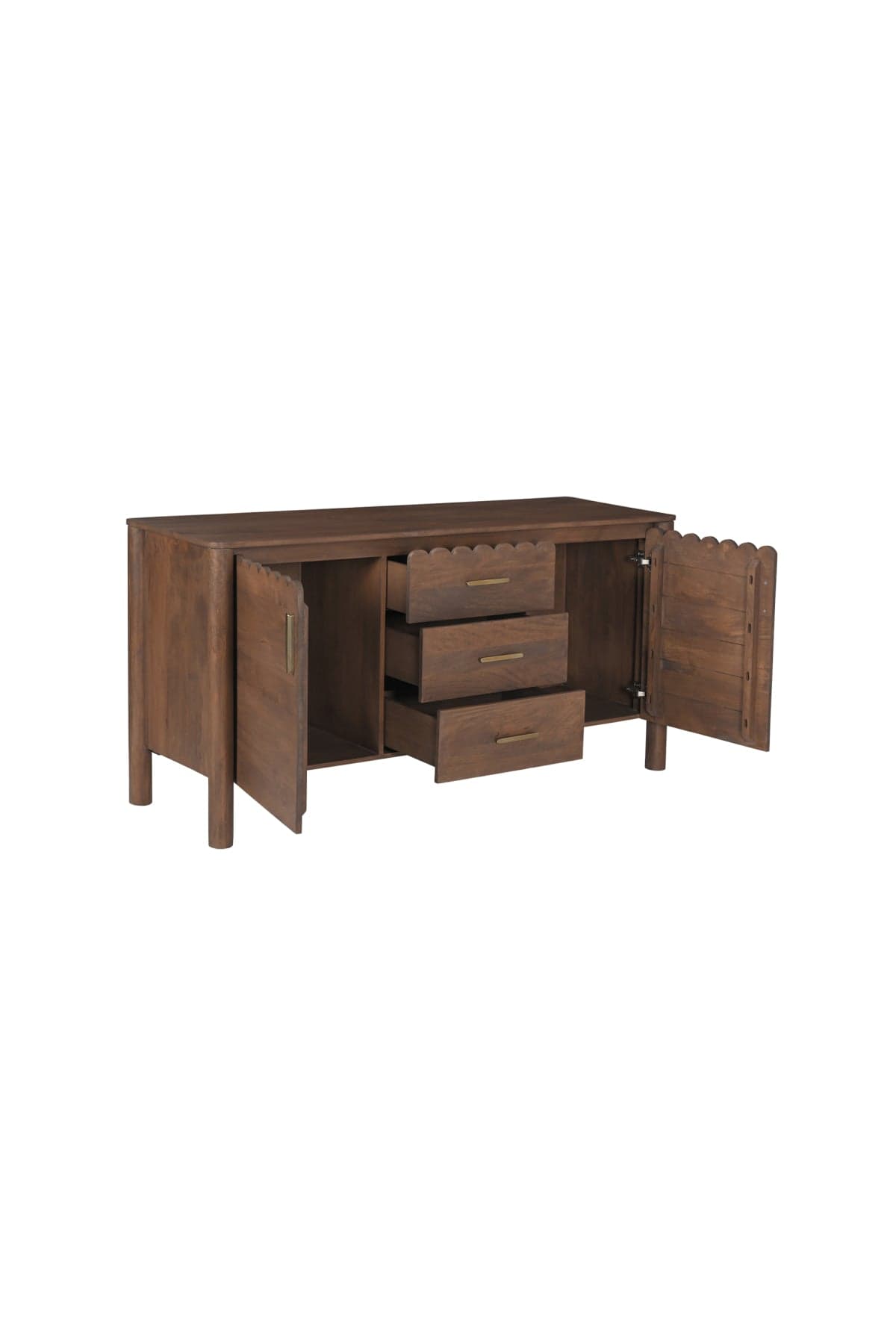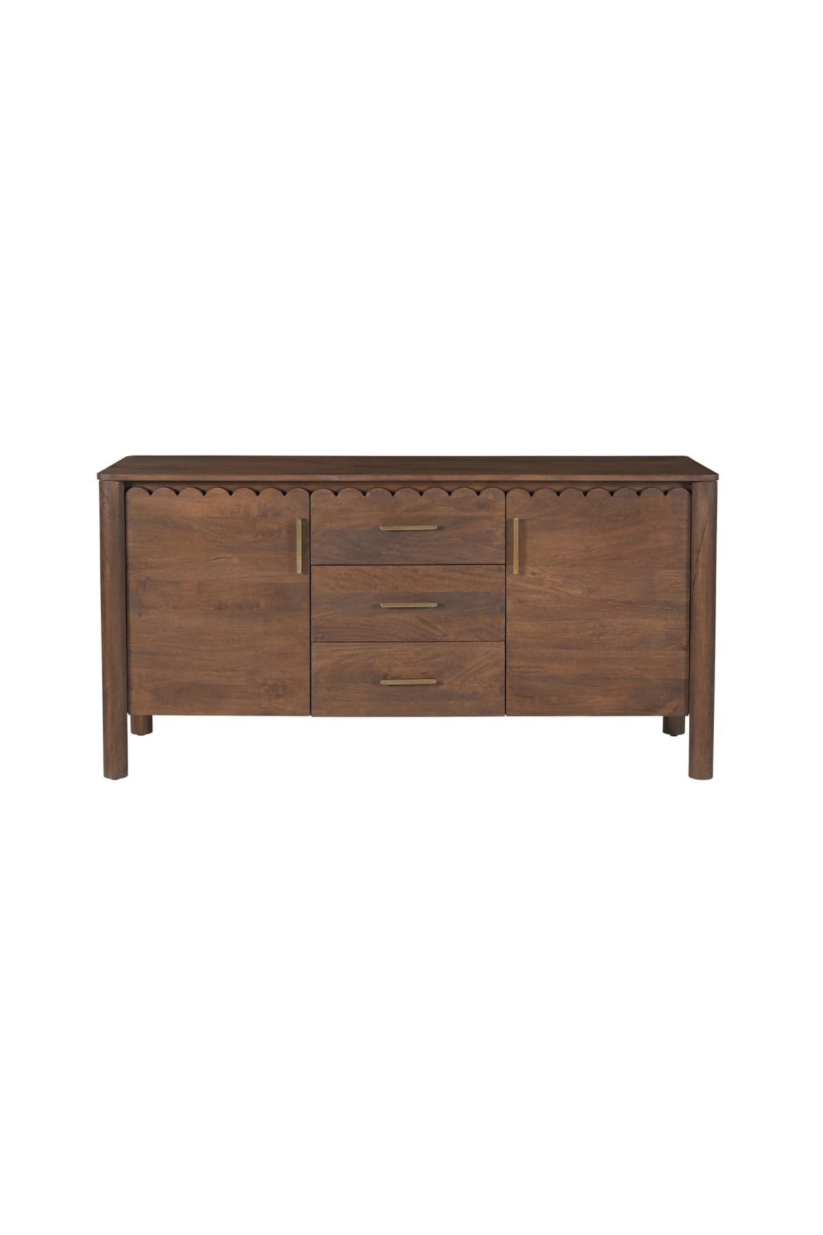Modern aesthetics effortlessly blend with the refined simplicity of traditional Shaker design in the Wiley 3 Drawer Sideboard - Vintage Brown. Meticulously crafted, its elegant form is defined by sleek, geometric curves that add a captivating touch of modernity. The post legs stand as pillars of strength, grounding the sideboard with their understated presence. A showcase of intricate scalloped edge details and heavy brass handles, these delicate elements lend a timeless charm reminiscent of classical influences.