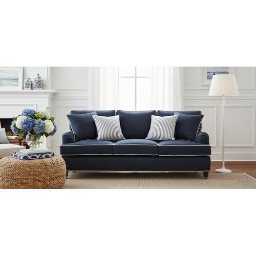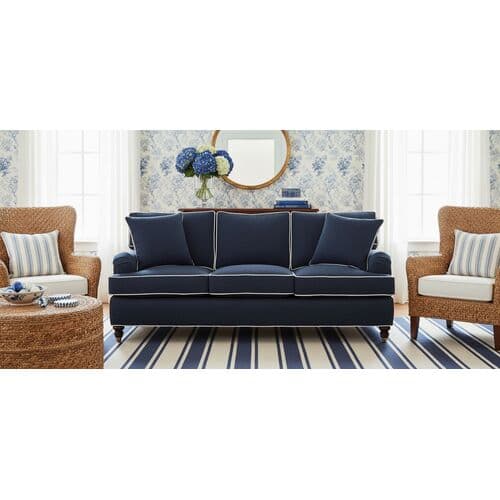 Crafted in navy Crypton, a premium fabric that resists stains, spills, mold, and bacteria, this sofa is designed for longevity, staying fresh over time. Its sturdy construction includes kiln-dried hardwood legs and foam fill wrapped in a fiber blanket for superior comfort and support. The addition of a white contrast welt and golden ferrules gives the sofa added elegance. Includes two matching throw pillows. Proudly handcrafted in the USA.