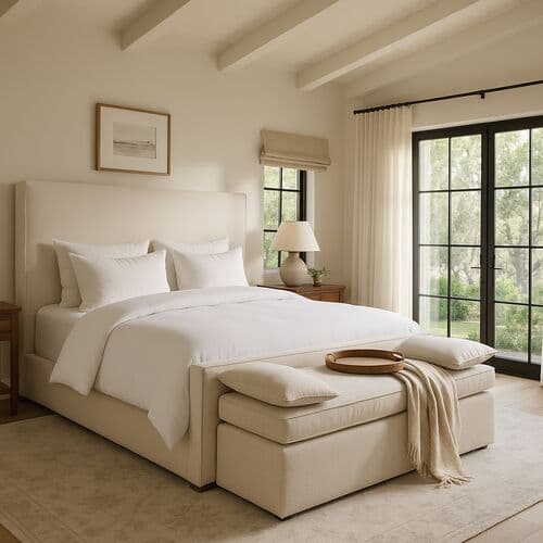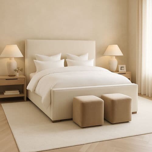With neutral-hued linen upholstery and a clean-lined silhouette, this panel bed offers a refined touch to any decor style. The look is anchored by block feet made from reclaimed alder. Requires a mattress and box spring.