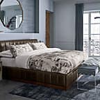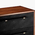 Minimal wood frame holds four deep drawers fronted with beautiful black vegan leather. Slim black wood handles with brass detail stretch nearly the length of the drawers. Inset cylinder-like legs clad in brass create a clean, elegant line. Learn about VUUE on our blog. CB2 exclusive.