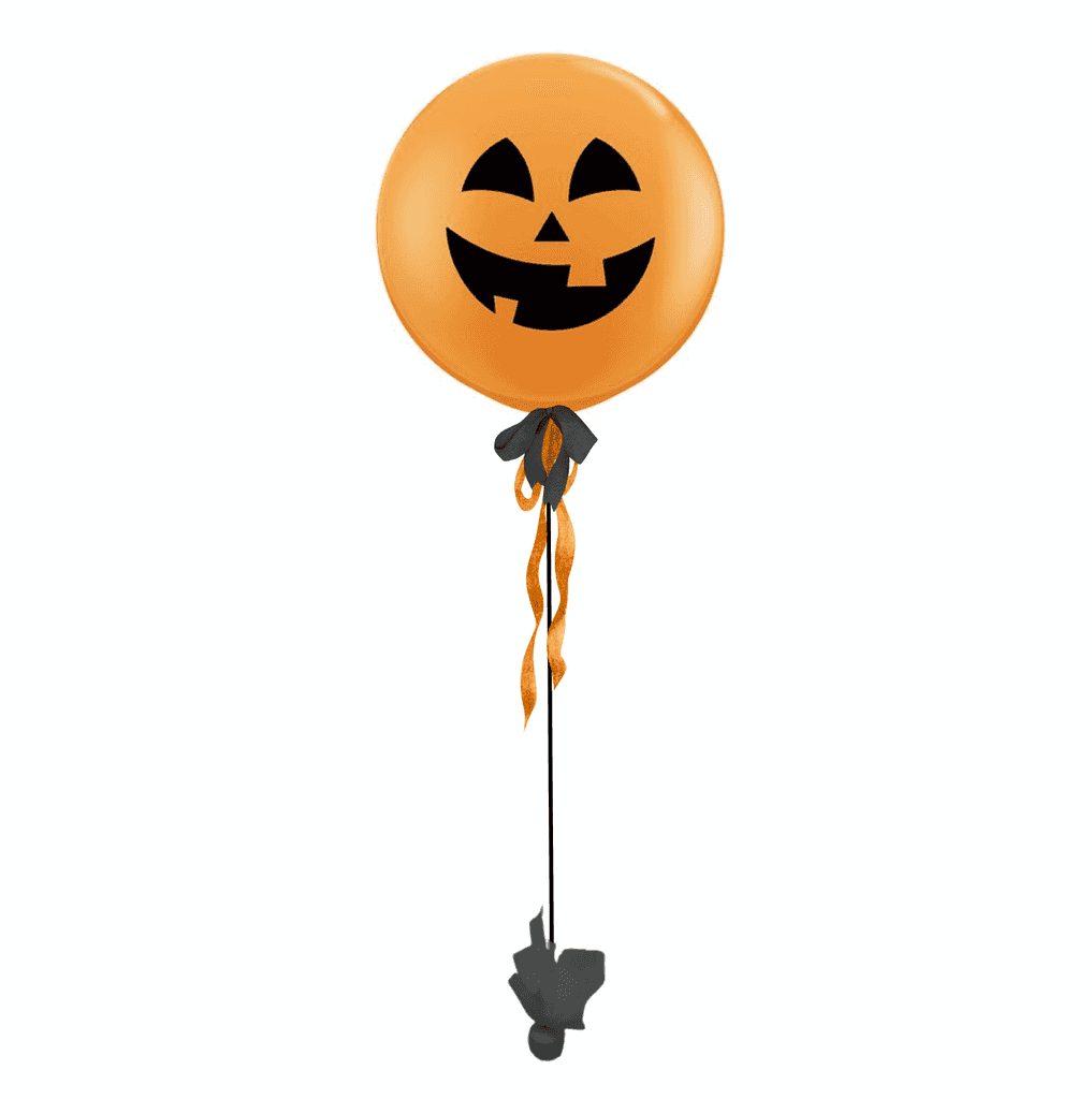 This giant pumpkin latex (36") is 3' round latex balloon with hanging ribbons as embellishments on a large black anchor. Includes a gift tag that reads "Trick Or Treat!"