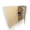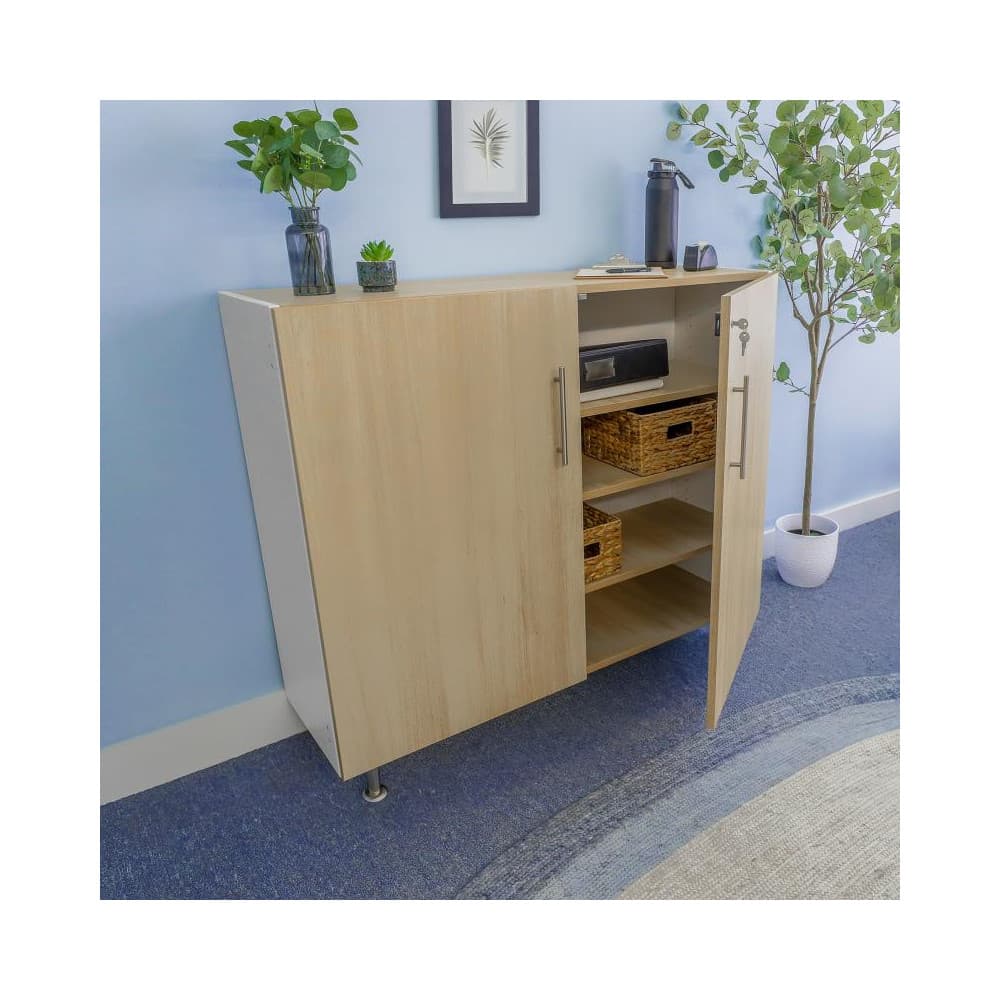 Form and function combine fluidly in this stylish cabinet! The contrasting white and textured white oak panels form crisp, clean lines offset by satin chrome handles and brushed nickel legs with integrated pads to protect floors. Behind the locking soft-close doors is a spacious cabinet with one fixed and two adjustable shelves that accommodate your need for flexible storage. Ships fully assembled and coordinates with all other pieces in the sophisticated chic and thoroughly modern elevatED™ Collection. Constructed in 3/4-inch thermofused white and textured white oak melamine with edge banding and no visible screws or unsightly plastic joinery for a fine finished furniture look. Made in USA. GreenGuard™ Gold certified. Lifetime Warranty.