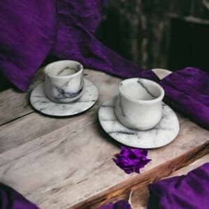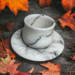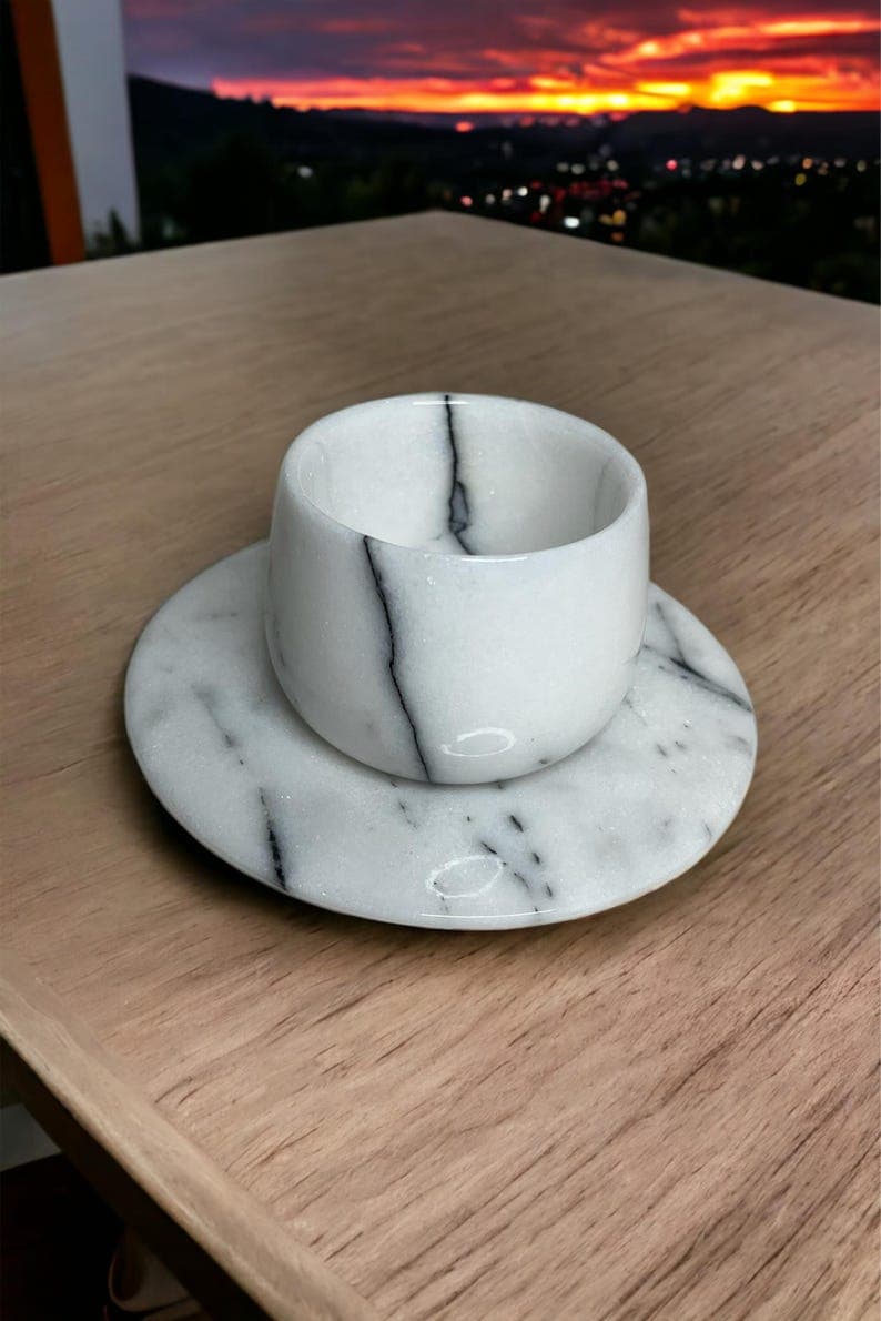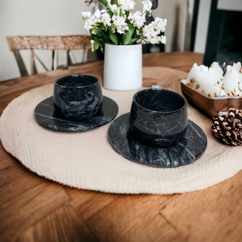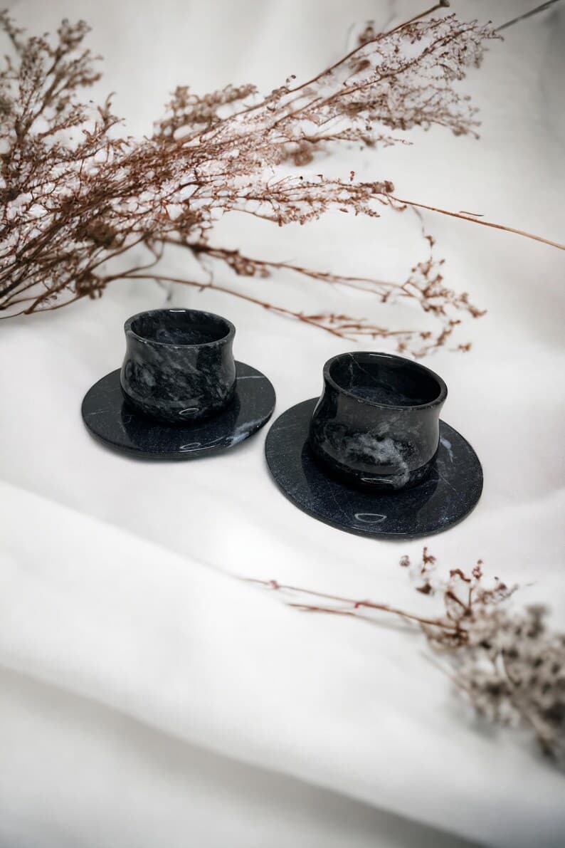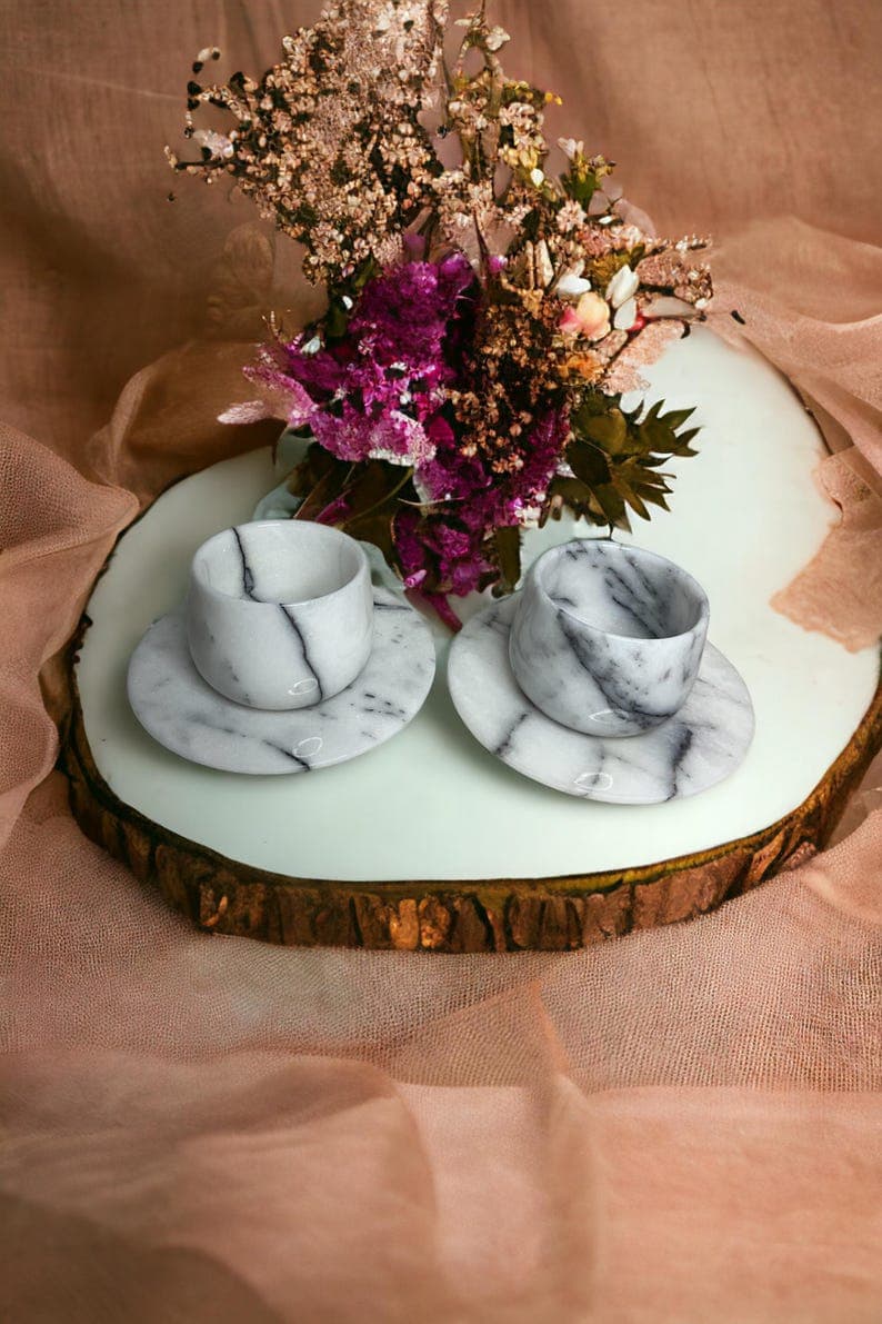 This elegant Marble Espresso Set includes two espresso cups with matching saucers, handcrafted from natural marble. With its luxurious finish and artisanal quality, this set adds a sophisticated touch to your coffee ritual. Color Options: White Marble or Black Marble. Model Options: Basic Model: Features a classic, straight cup design. Curved Model: Tapers at the middle with a graceful curve for an added touch of style. Customization: A perfect choice for a special gift! We offer the option to engrave names or logos on the set. Create a unique and memorable gift with this personalized touch. Handcrafted and Natural: Made from genuine natural marble, each piece is unique, showcasing the beauty of nature in every detail. Care Instructions: To preserve its longevity, we recommend hand washing. Why Choose This Set? With its unique, handcrafted design, this set makes an elegant gift for any occasion. Personalizable to create a meaningful, one-of-a-kind present for loved ones. Made from quality natural materials, ensuring durability and timeless beauty.