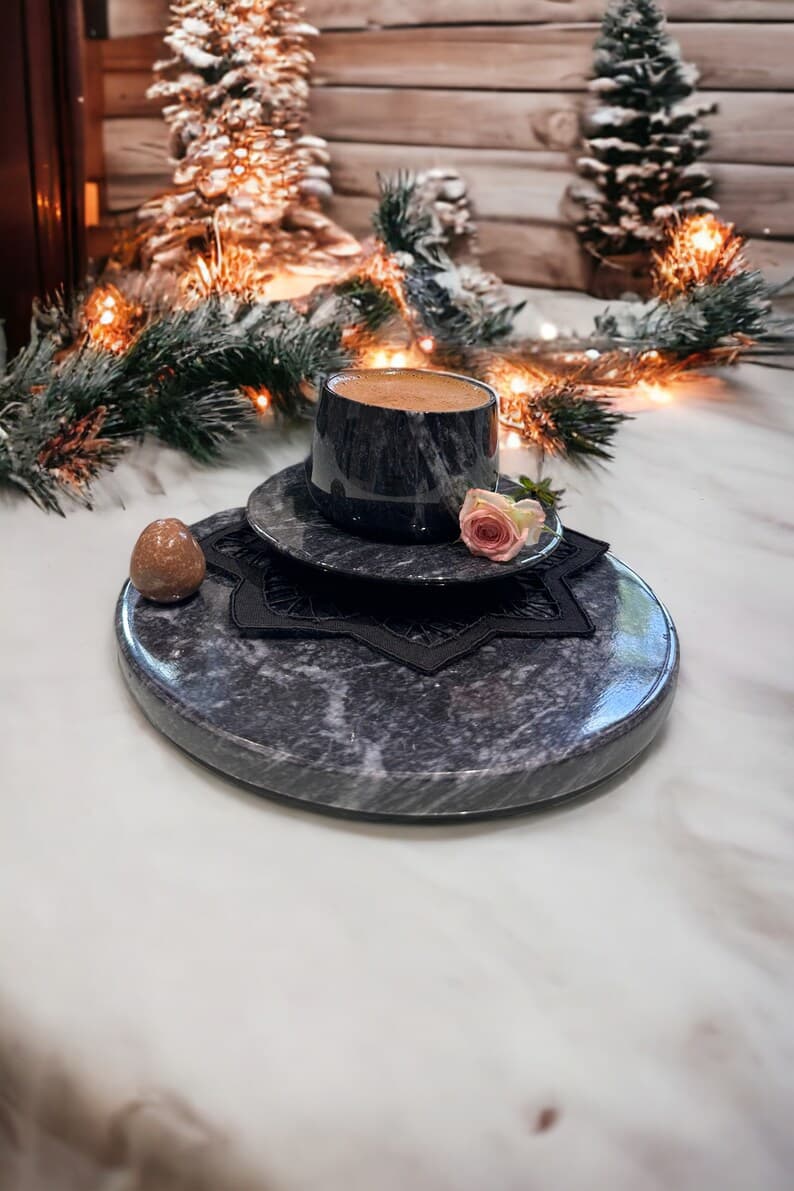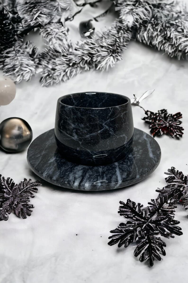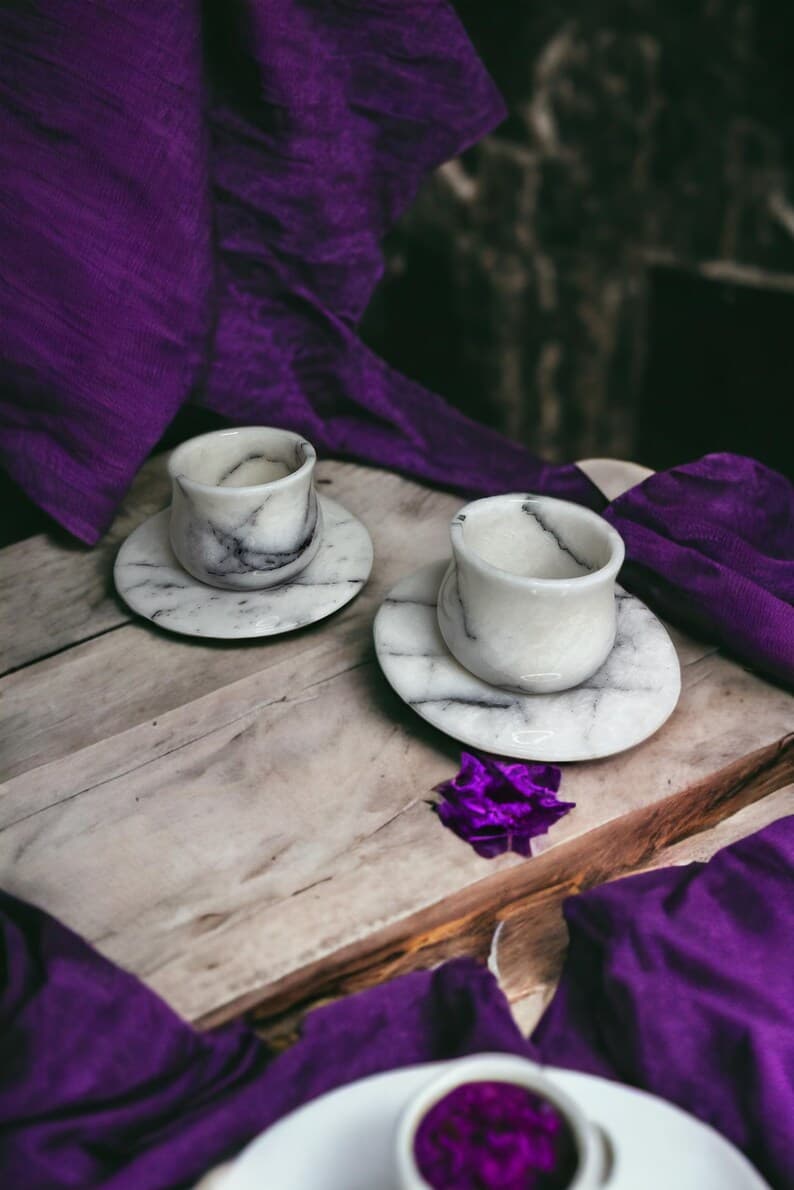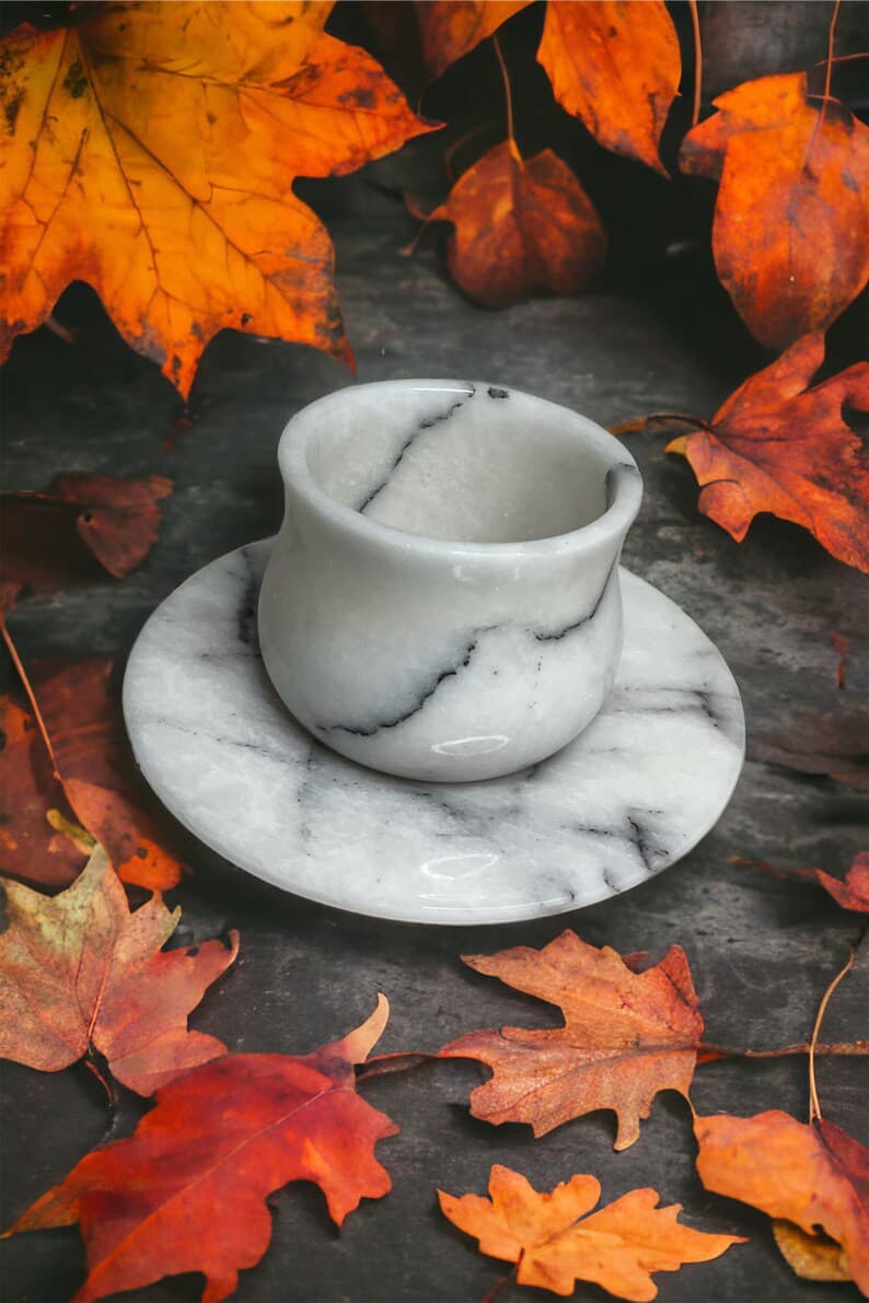 This elegant Marble Espresso Set includes two espresso cups with matching saucers, handcrafted from natural marble. With its luxurious finish and artisanal quality, this set adds a sophisticated touch to your coffee ritual. Color Options: White Marble or Black Marble. Model Options: Basic Model: Features a classic, straight cup design. Curved Model: Tapers at the middle with a graceful curve for an added touch of style. Customization: A perfect choice for a special gift! We offer the option to engrave names or logos on the set. Create a unique and memorable gift with this personalized touch. Handcrafted and Natural: Made from genuine natural marble, each piece is unique, showcasing the beauty of nature in every detail. Care Instructions: To preserve its longevity, we recommend hand washing. Why Choose This Set? With its unique, handcrafted design, this set makes an elegant gift for any occasion. Personalizable to create a meaningful, one-of-a-kind present for loved ones. Made from quality natural materials, ensuring durability and timeless beauty.