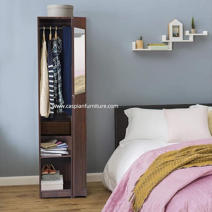 1. Caspian Furniture offers a premium mirrored One Door Wardrobe with a drawer 2. The wardrobe opens out to a central hanger console for keeping all your clothes organized. 3. The sleek door handles add to its unique style. 4. The engineered walnut wood ensures 100% fungus as well as termite resistance.