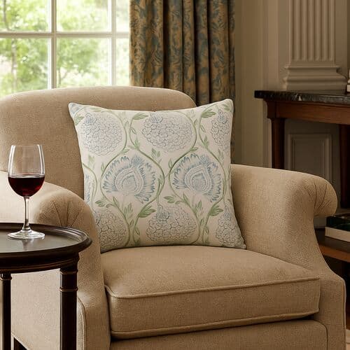 This exclusive pillow decorates a sofa or chair with its cotton fabric and block-inspired floral pattern on a neutral background. It's reversible, featuring the pattern on both sides, and includes an insert.