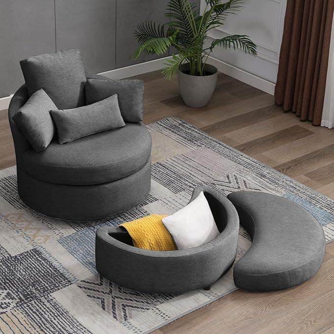 【360-Degree Rotating】This swivel chair features a 360-degree rotating capability, allowing you to conveniently attend to your surroundings without getting up. Experience the convenience and efficiency of this practical design for your relaxation and comfort at home. 【Storage Ottoman】The separate ottoman of this barrel swivel chair provides multipurpose placement options to cater to your preferred resting positions. With its generous size of 33.46" x 15.75" x 18.11", it also doubles as a storage solution. Simply lift the semicircular cushion on top of the storage ottoman to reveal ample space for storing magazines, remote controls, children's toys, and other daily items, keeping your room neat and organized. 【4 Customizable Pillows】Designed with a semicircular backrest, this swivel swivel chair comes with four additional pillows that can be arranged according to your preference. These pillows enhance the softness of the backrest and provide optimal support for your seating posture. 【Soft Fabric】Crafted from breathable linen fabric, this futon swivel chair offers a gentle and skin-friendly touch, ensuring a dry and cozy experience even during extended periods of sitting. The high-quality linen material resists wrinkling, making it easy to clean and maintaining a dust-free environment. 【Premium Frame Construction】The lounge swivel chair constructed with high-quality solid wood, reinforced with metal components and a sturdy base. Its smooth and stable rotation base ensures a safe and seamless 360-degree rotation experience.