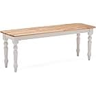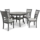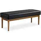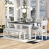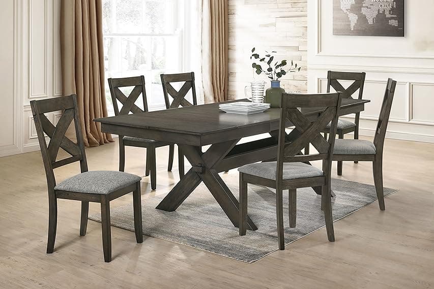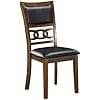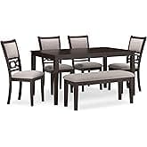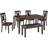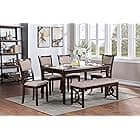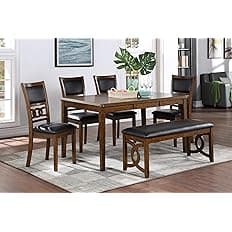 The New Classic Gia 6-Piece Wood Rectangle Dining Set is crafted from solid Rubberwood and Mindi veneers for a perfect blend of durability and aesthetic appeal. The warm brown finish, achieved through a meticulous multistep process and clear coat, accentuates the natural grain of the wood, adding a touch of timeless elegance to your space. The 60-inch dining table comfortably accommodates six, making it an ideal gathering place for family dinners or game nights. The chairs, with their distinctive interlocking chain back design, provide both style and comfort with black PU upholstered cushions. Supported by sturdy solid wood legs, these chairs are built to last. Tapered legs and clean lines complete the transitional look of this set. Your purchase includes the easy to assemble dining table, four chairs, and a bench. Plus, enjoy peace of mind with a one-year warranty. Upgrade your dining area today with this classic and functional dining set.