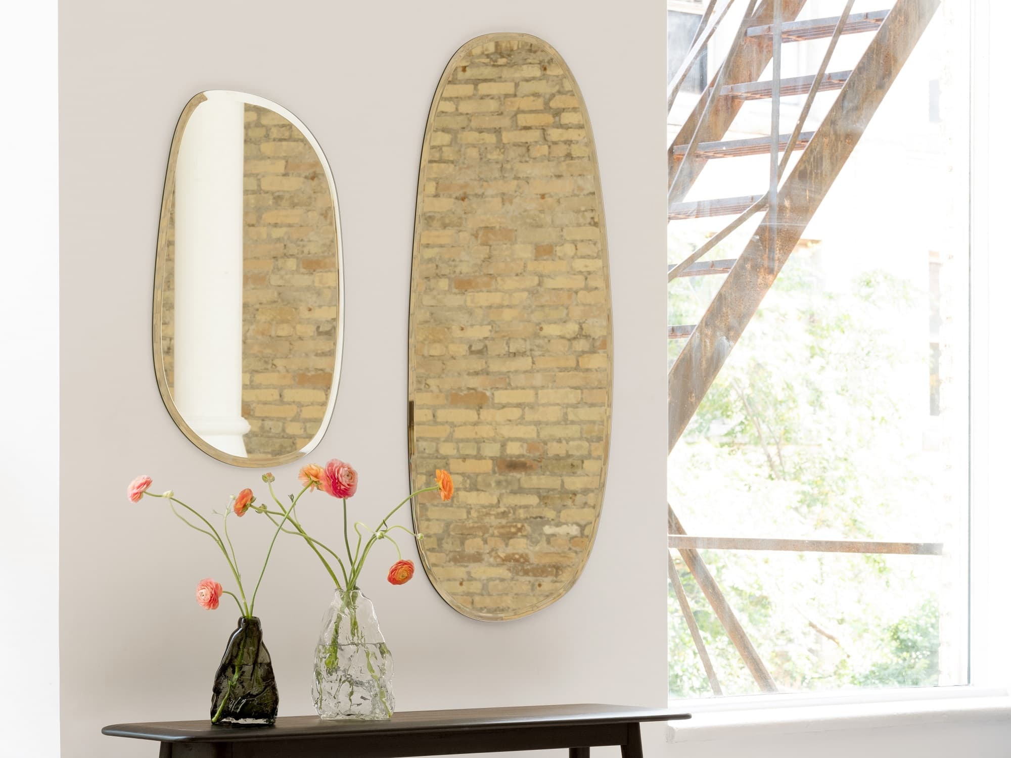 The frameless Puddle mirror collection features organic and minimal shapes, which can be mounted in any direction to perfectly suit your space. Hang a Puddle mirror on its own or combine different sizes to create your personalized arrangement.