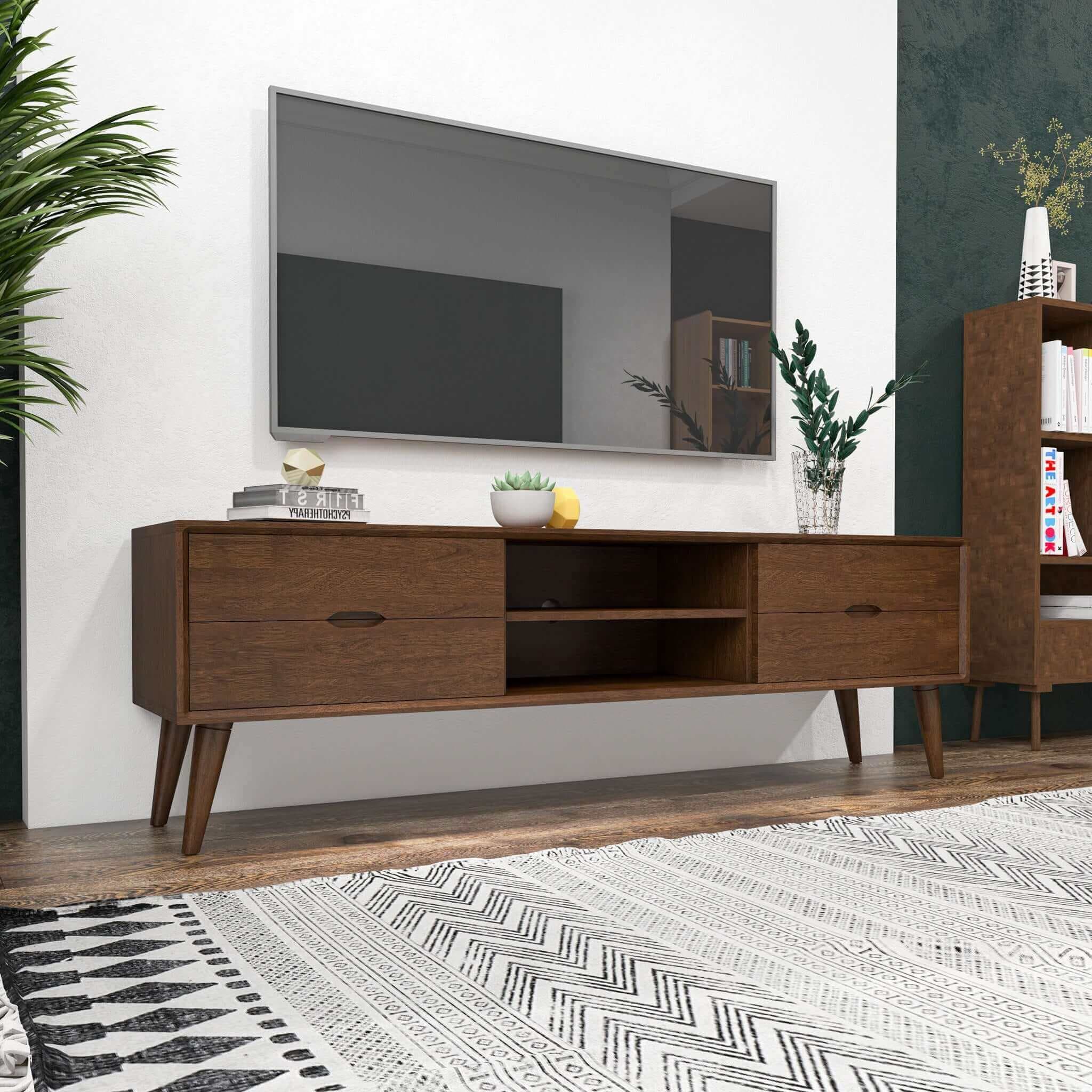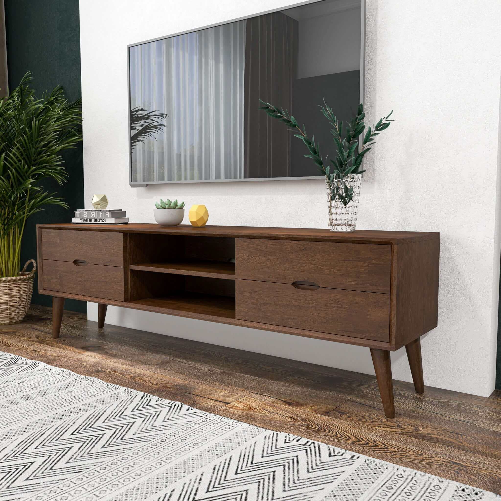 Give your entertainment space some added appeal with this modern TV Stand to transform your living space with retro modern intrigue. This extra quality media console table is perfect addition to any recreation area, entertainment center, living room, bedroom, game room, office and media rooms. Modern designed Tv stand accommodates flat screen TVs up to 65 inch. This tv stand also can be used as side board with storage unit for living room features combination of functional shelves and drawers while cable management holes keep living spaces clean and tidy. Functional entertainment center for living room constructed with kiln dried solid wood with walnut color. Rich wood veins shows natural quality and aesthetic. Metal knobs and tapered splayed solid hard wood legs are durable and elegantly attached to make modern accent. This entertainment stand will help you organize all your media devices and accessories Use it as a TV & media furniture in your living room, a storage cabinet in your bedroom, or a buffet in your kitchen or dining room. Display your flat screen on its solid wood top or hung on the wall above. This tv entertainment center can accommodate various size of TV's up to a 65". This TV cabinet match with 43 inch tv, 50 inch tv, 55 inch tv, 65 inch tv. These dressers also can be used for bedroom build with all natural material that comply with TSCA regulations and ASTM International's industry standard. Constructed of solid wood 4 drawers media unit Open cabinet with an adjustable shelf and a cord cut out Assembly required