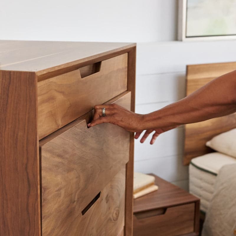 We handcraft our Mid-Century Modern Dresser in our FSC®-certified (C156318) Los Angeles woodshop with solid walnut or maple wood. The elegant mid-century design features sturdy, angular legs that provide stable support for this timeless heirloom. Available in tall and horizontal options. Part of our Mid-Century Modern Furniture Collection, the Mid-Century Modern Dresser pairs perfectly with our Mid-Century Modern Bed Frame and Nightstand.