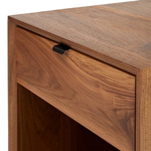 Modern black walnut nightstand constructed with in solid wood set on cantilevered blackened steel base. The handcrafted nightstand has a top drawer for concealed storage with black steel door pull and soft close hinges. Designed by Kirk Van Ludwig.