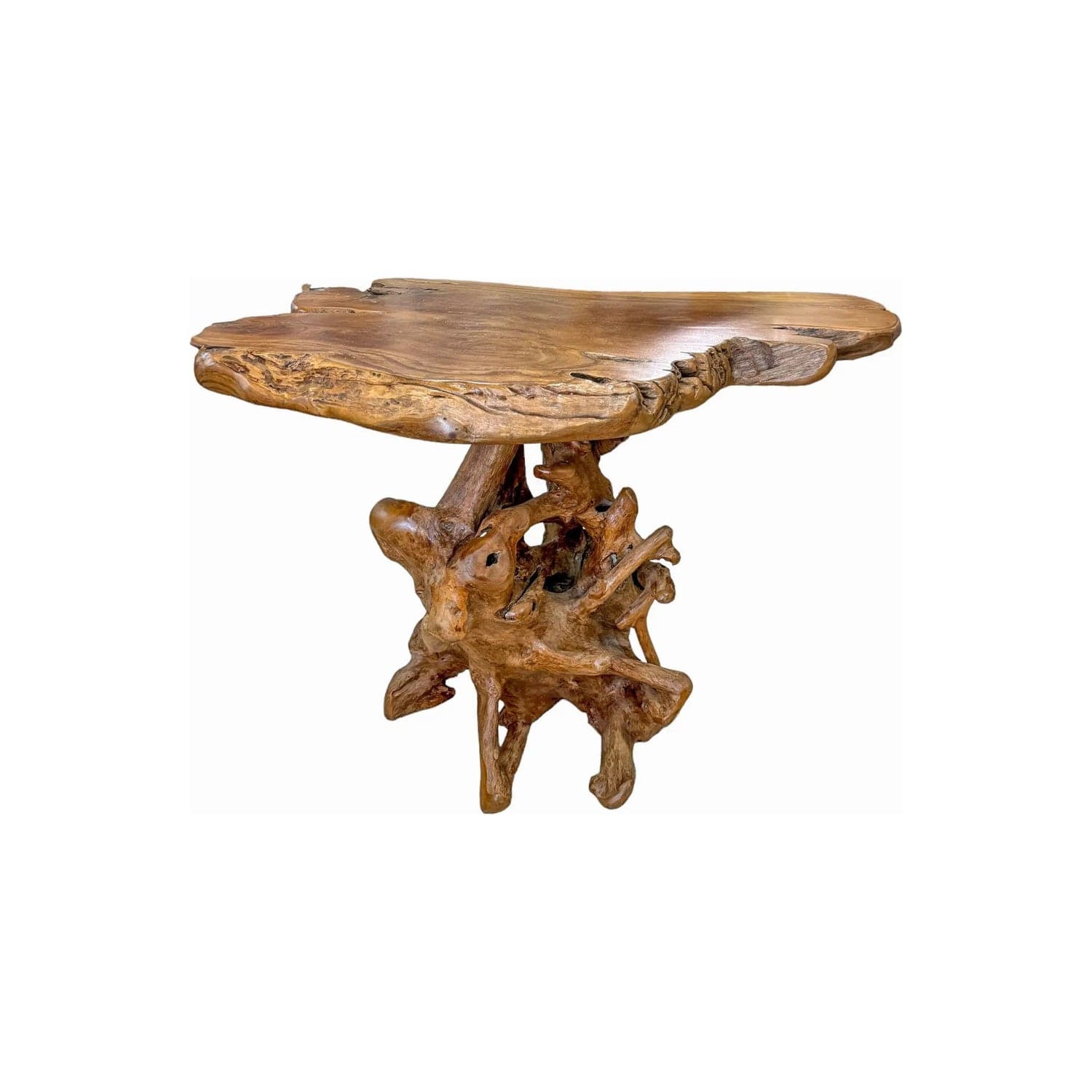 Teak root slap top bar table Made in Indonesia Dimensions: 52”L x 40”H x 40”W