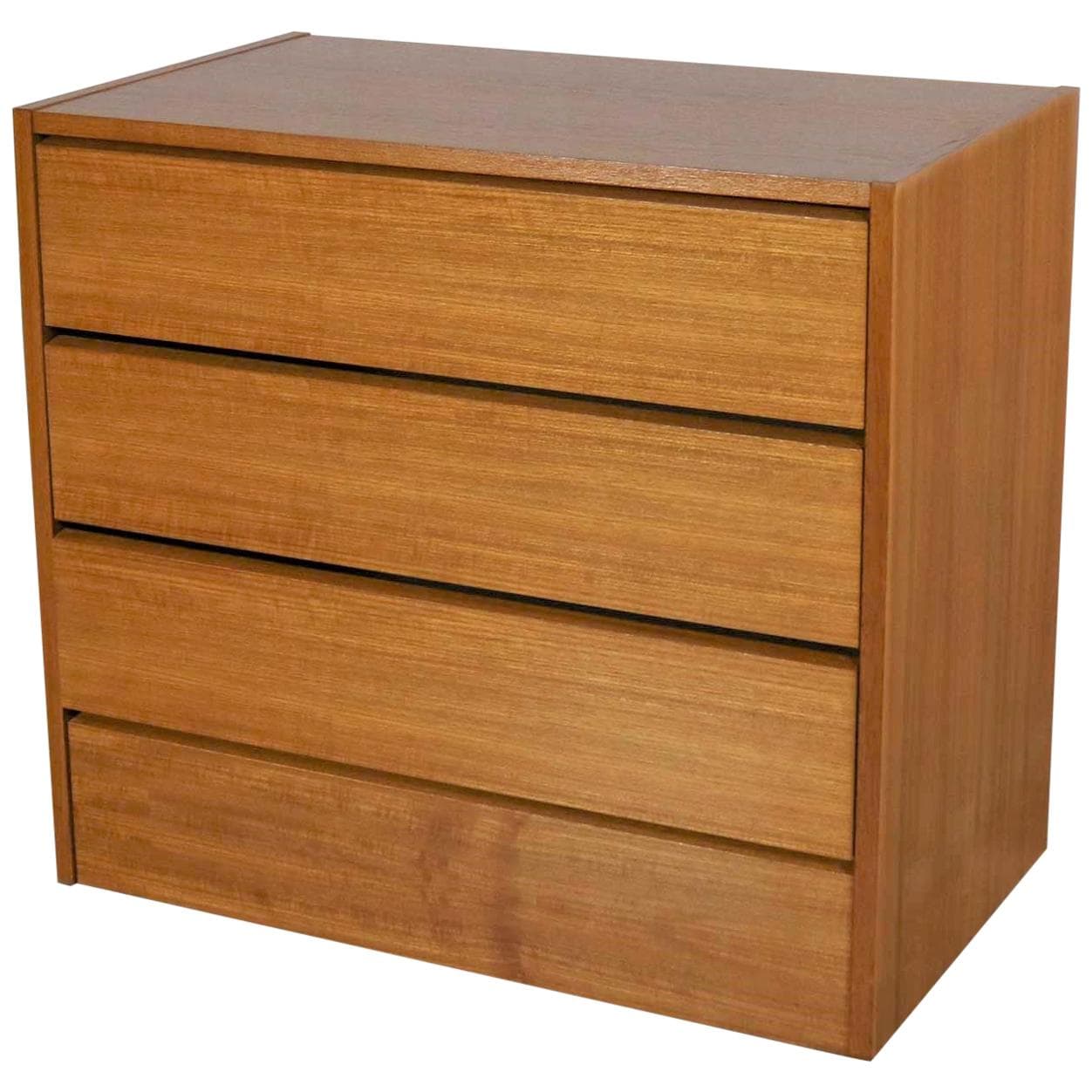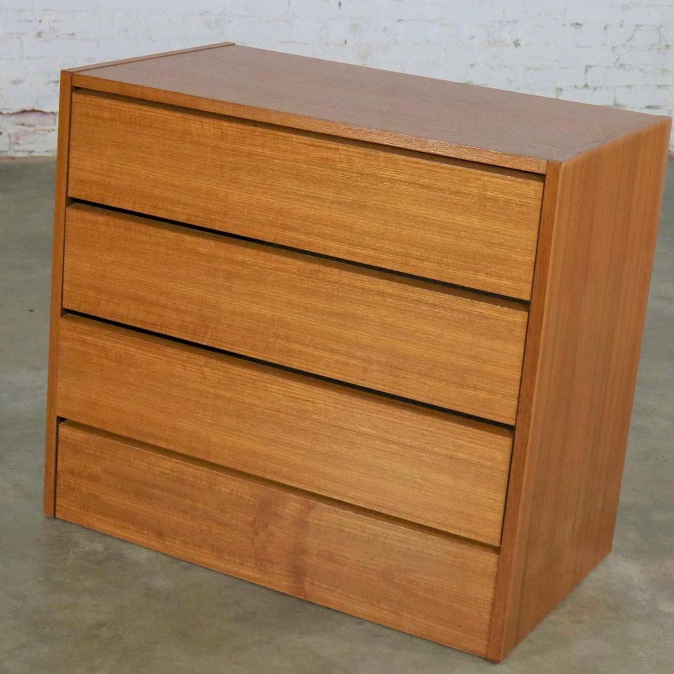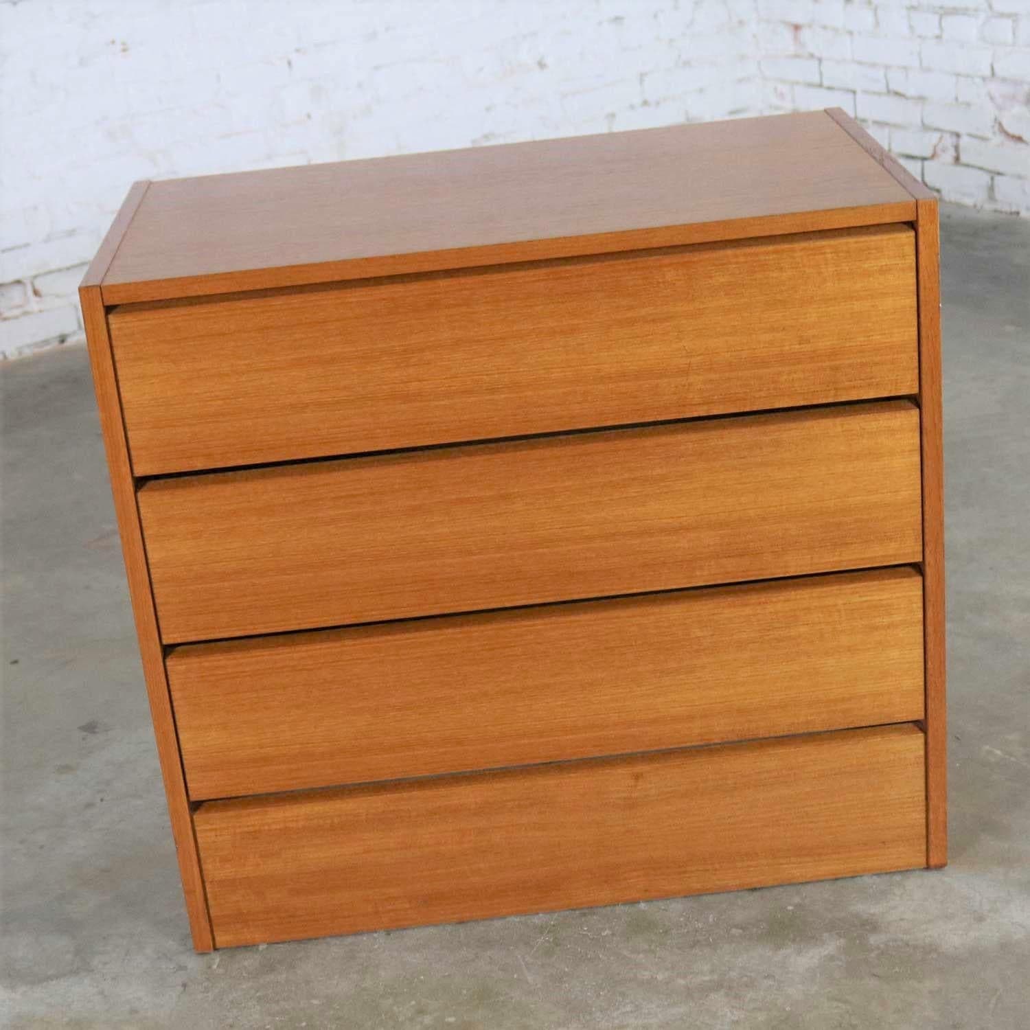 Handsome small Scandinavian Modern teak three-drawer chest marked made in Denmark. It is in wonderful vintage condition with no outstanding flaws that we have detected. Please see photos, circa 1970s-1980s. Sometimes you just need a perfect small chest and here it is. Its not too small. And not too large. It is just right! Scandinavian Modern and made in Denmark circa 1970s-1980s. It is comprised of all teak veneer in typical Danish design with no hardware on its three equal height full-width drawers. It is just right for a small entry, dining room or living room. Or, use it as a nightstand. Of course, it is just right for your Mid-Century Modern or Scandinavian Modern home, but it also complements many other décor styles such as modern country or Industrial loft. This is the perfect little chest and just right for many places. We know you love it. Make it yours!