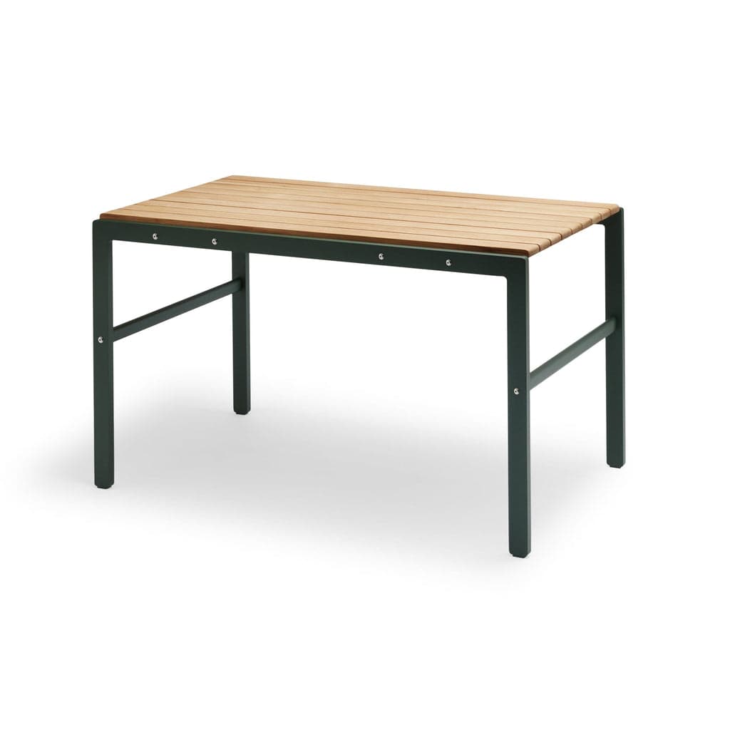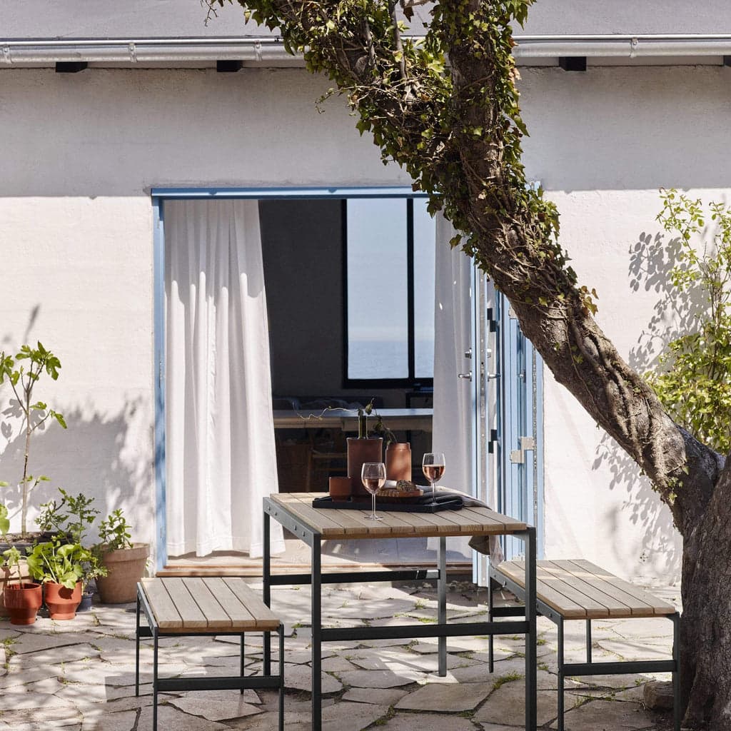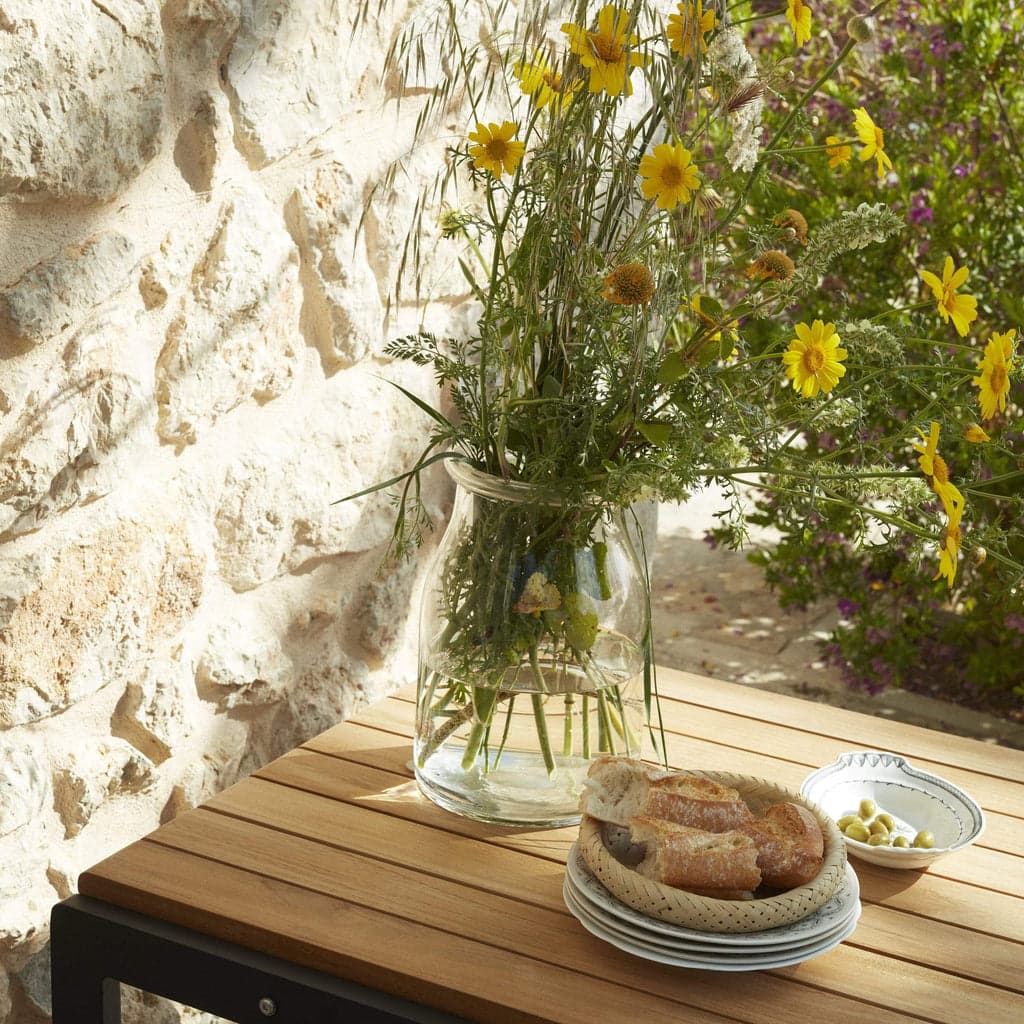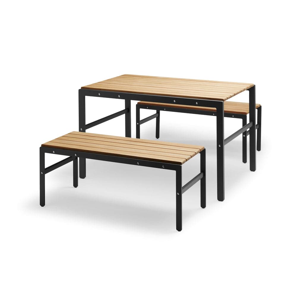 Light, powder coated aluminum meets untreated teak. This wood/metal version of Reform table brings together industrial and natural elements in a classical design where small details such as the visual fittings on the sides stand out. The table carries a simple but contrasting style which makes it highly compatible with other outdoor furniture in various materials and settings. Proper usage and maintenance is vital for getting the most out of valuable pieces. These pieces are made to last for generations, but just like everything else, they need a little care to get there. Do a general cleaning when needed with a suitable wood cleaner and soft bristle brush. Rinse afterwards with clear water and let it dry. As the wood is untreated, the surface will patina over time and eventually turn into a beautiful silvery grey colour. If you wish to preserve or intensify the original honey-golden colour, use a suitable furniture oil on a regular basis. No matter what you choose, the wood will be resistant to everyday wind and weather thanks to the high content of natural oils. Outdoor Natural Oil can be purchased separately. During winter we advise you to store the furniture in an unheated room such as a garage or cellar. Lead Time: On average, 2 weeks