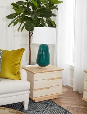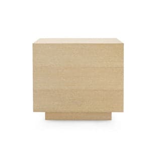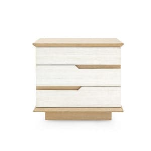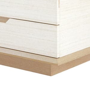 Crafted from solid oak, the Simon Side Table exudes a timeless elegance that will captivate your senses. The organic grain patterns and rich hues of the wood create a warm and inviting ambiance, while the Clear Lacquered Silky Grasscloth adds a touch of refined texture. Designed to make a statement, this side table sits proudly on a platform base of Cerused Oak, showcasing its sleek and modern silhouette. The cutouts, cleverly integrated into the design, not only serve as pulls for the drawers but also expose the same beautiful wood, creating a harmonious and seamless aesthetic. With its low-to-the-ground profile, the Simon Side Table functions perfectly as a side table or a small media console.