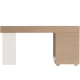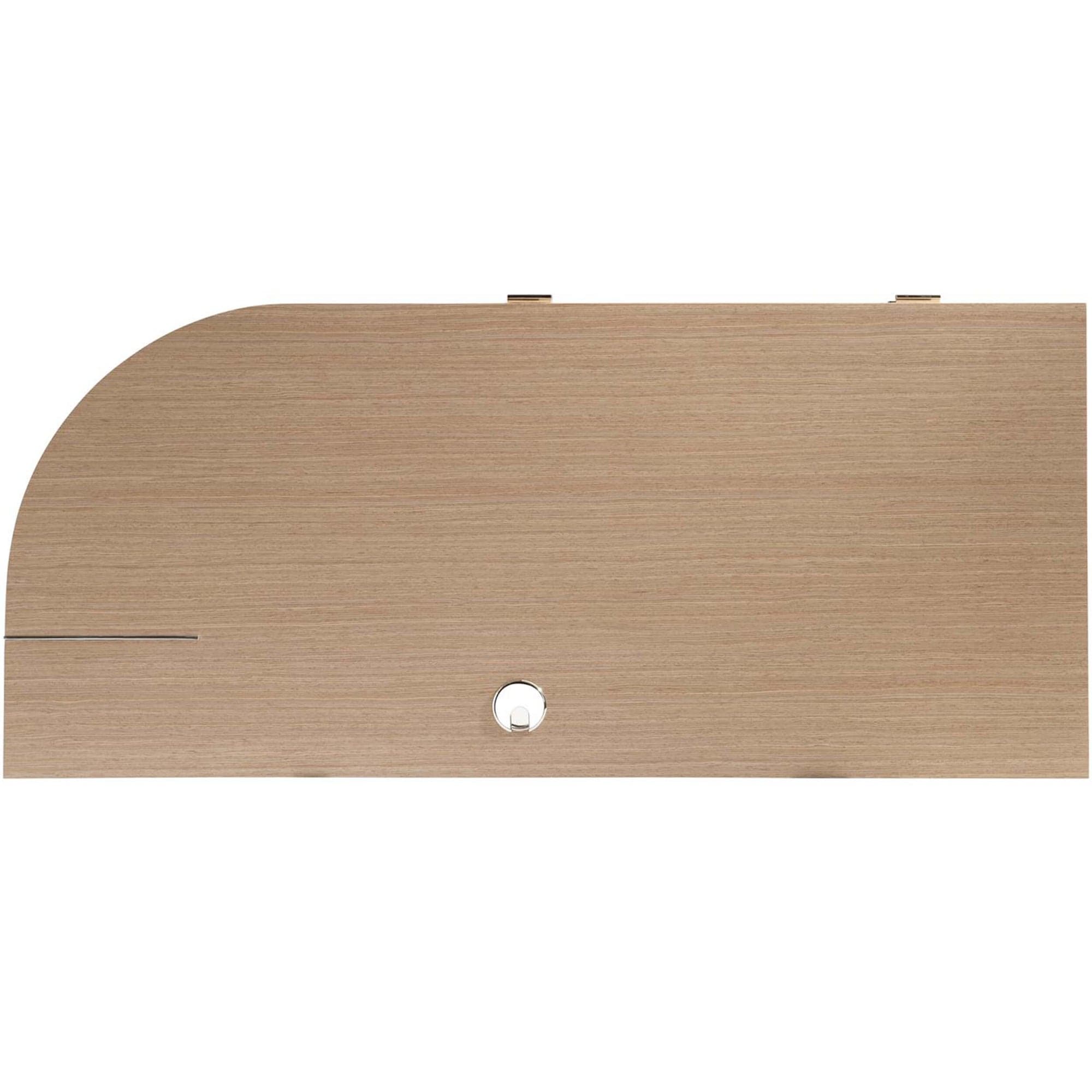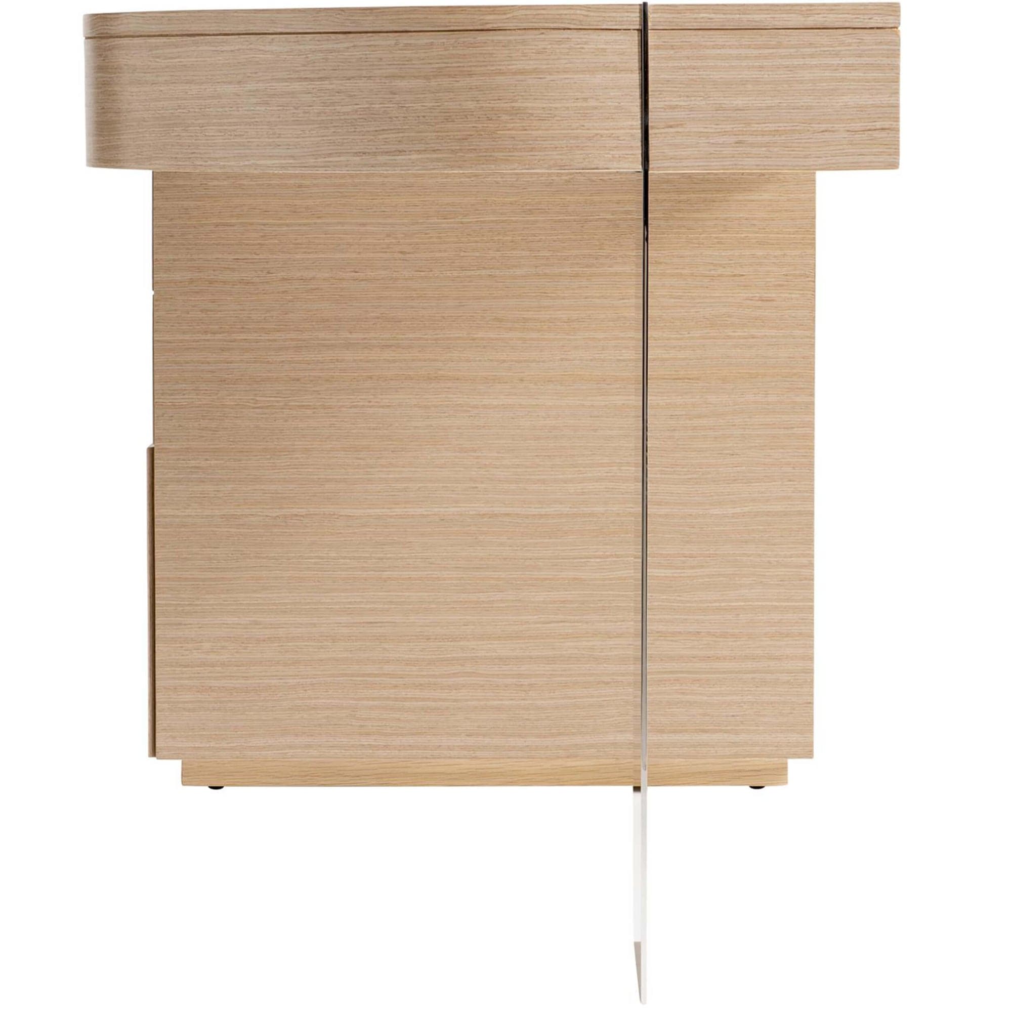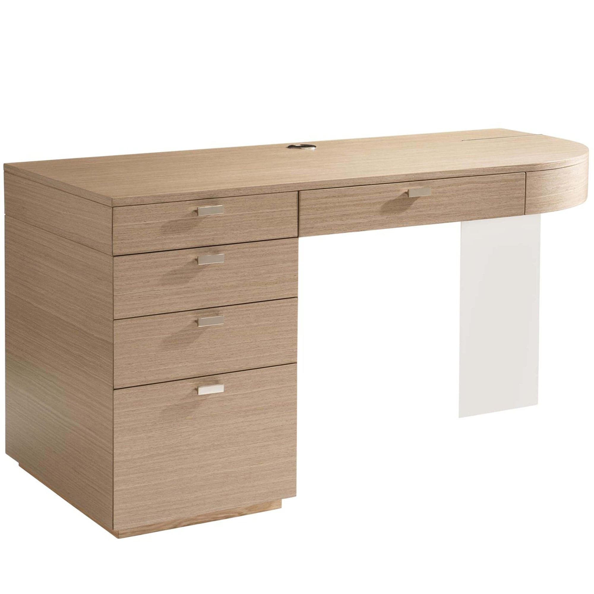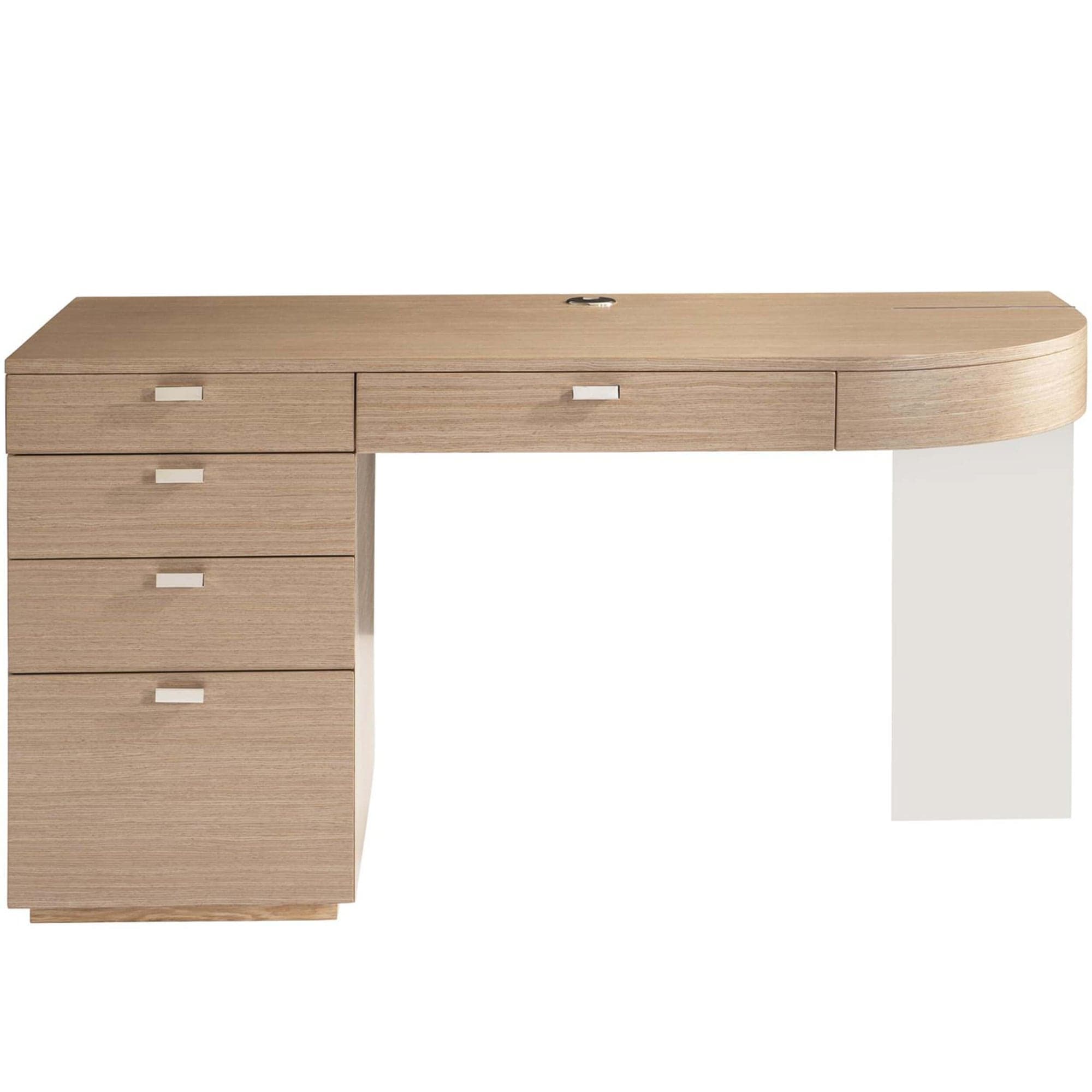 The Modulum desk is a work of art, balancing form and function in equal measure. The stunning design features a sculptural look with a wood top and drawer pedestal, as well as a sheet of polished stainless steel supporting the opposite side. This desk offers hardworking details, including five storage drawers, a center drawer with a drop-down front, and a receptacle with outlets and USB ports.