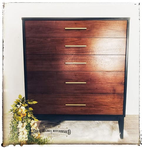 Painted with black chalk paint and retained, 38"×19"×45". Five Dovetailed drawers!
