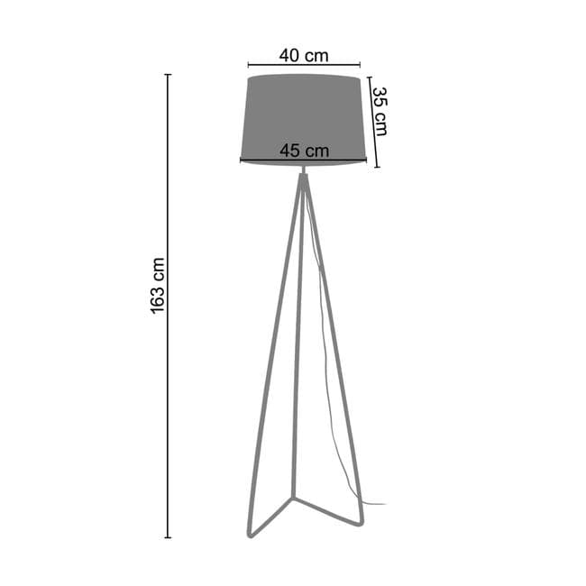 Candeeiro pé alto PIED TRIANGLE redondo metal preto e branco - Abajour Tecido côr branco forma Tambor - Suporte de lâmpada E27 x1 luz - Lâmpada não incluida -recomendado: LED de 7W (halogénio, máx. 40W) tipo standard A19 - Projecção de luz:Ambiente - Alimentação rede eléctrica:Ficha Elétrica tipo C (Europlug), ou tipo G(UK) - Interruptor no cabo eléctrico - Estilo design - Classe de protecção II - Indíce de protecção: IP20 - Potência regulável, regulador não incluido - Voltagem de funcionamento: 230V - Tensão de alimentação: 230V - Dimensão abajur: Altura 35cm x Comprimento 45cm x Largura 40cm - Dimensão global: Altura 163cm x Comprimento 45cm x Largura 45cm - Peso liquido do produto: 4,1Kg