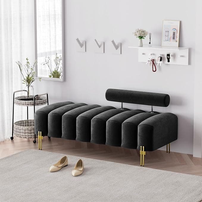 Enhance your comfort with our upholstered bed end bench, the modern bench is upholstered in a high quality breathable fabric that is soft, breathable and skin friendly. This high quality material ensures you can relax in ultimate comfort and style, making this Entryway Footrest the perfect addition to your home decor. Add a touch of elegance and style to your home decor with our mid century bench, which features a unique modern channel design and sturdy metal gold legs. This sleek and sophisticated design makes this bedroom bench stand out and adds a touch of glamour to your space. Our end of bed bench comes with an adjustable round backrest that can be set to different heights to ensure your back is perfectly supported .And the Ottoman Bench can be customized your seating experience to suit your individual needs. Our bed bench for bedroom king is incredibly versatile, making the bedroom ottoman the perfect addition to any room in your home. Whether you want to place this velvet bench at the end of your bed, in an entryway, by a window, in a hallway, in a foyer, or as extra seating in a living room, bedroom or dressing room. It is very easy when it comes to assemble this long rectangular bedroom ottoman bench end of bed ,All you need to do is screw in the legs with tools,hardwares we provide with the bench.Size: 52.2"L*22"W*22.5"H