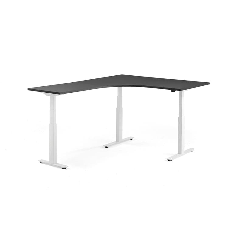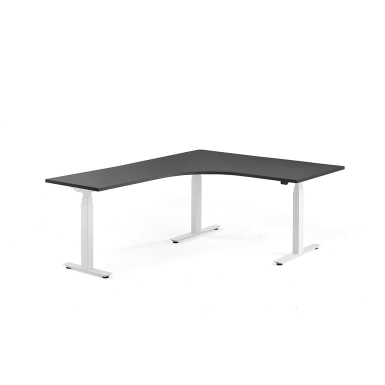 Elektrisch höhenverstellbar, 1600 x 2000 mm, weiß/schwarz. Elektrisch höhenverstellbarer Schreibtisch mit großer Arbeitsfläche. Ausgestattet mit einem 3-Bein-Gestell mit Antikollisionsmechanismus zum Schutz vor Quetschverletzungen. Große Hublänge (650 mm) für zusätzliche Flexibilität.